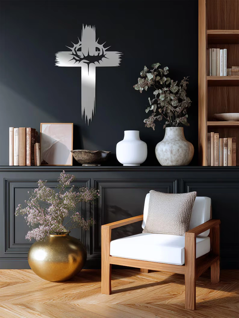 Krzyż metalowy na ścianę z koroną cierniową – nowoczesna symbolika
