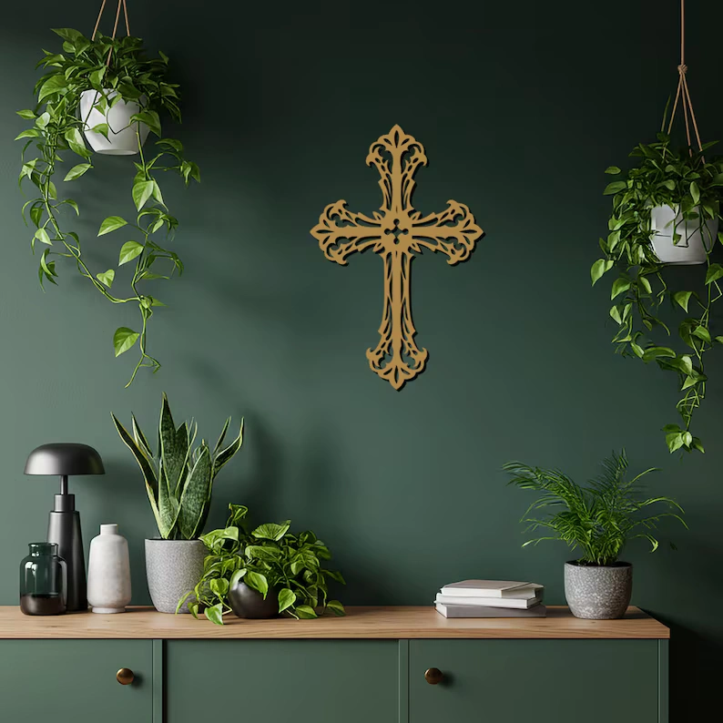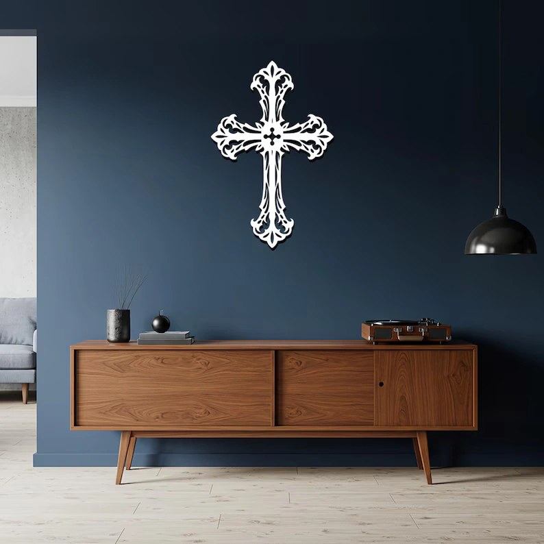 Krzyż metalowy na ścianę – Ornament Klasyczny został zaprojektowany z myślą o wnętrzach, w których liczy się ponadczasowa estetyka i harmonia formy. Delikatne zdobienia na ramionach krzyża przyciągają wzrok, zachowując jednocześnie stonowany i elegancki wygląd.
