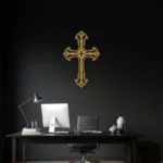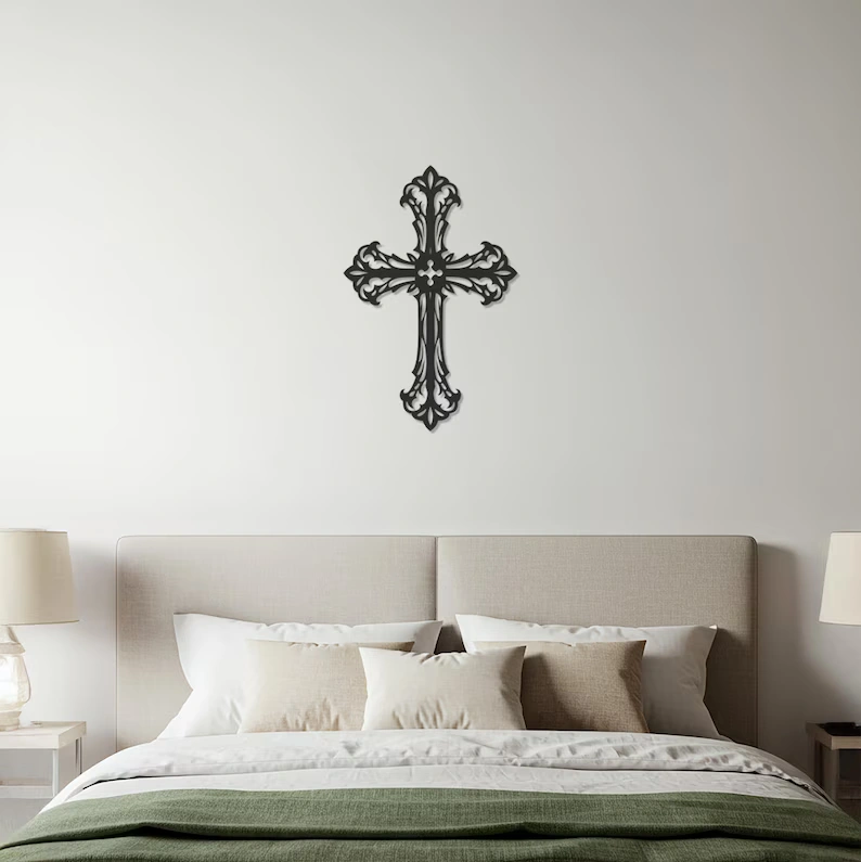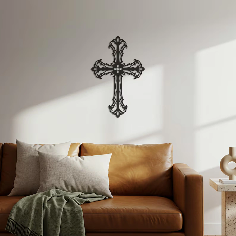 Krzyż metalowy na ścianę o klasycznej, ornamentalnej formie. Elegancka, ażurowa dekoracja wykonana z trwałej stali, inspirowana tradycyjnymi wzorami. Idealny do salonu, sypialni lub domowej kapliczki.