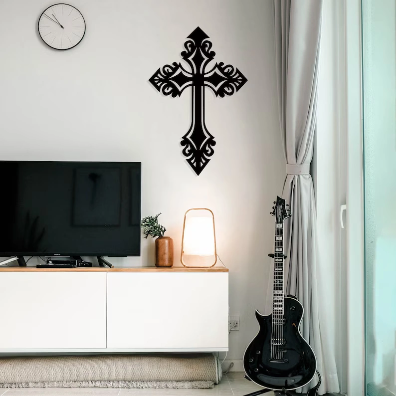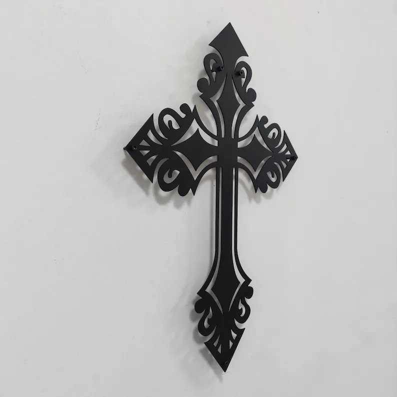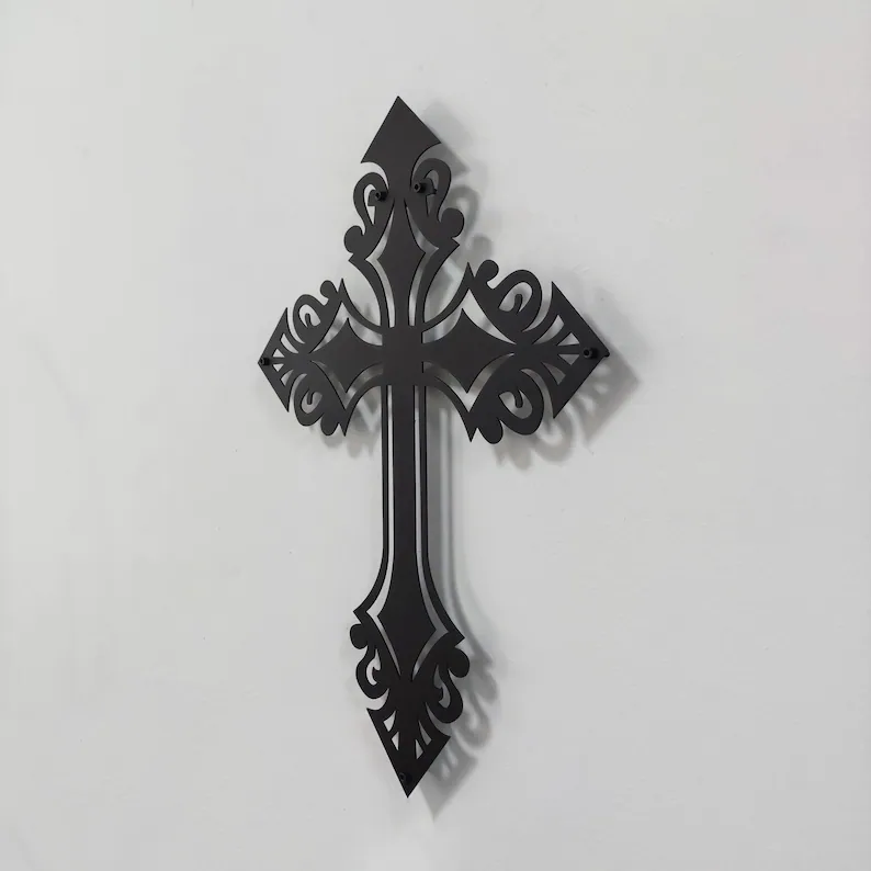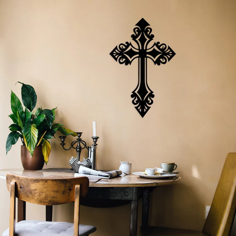 Ten krzyż metalowy na ścianę wyróżnia się symetryczną formą oraz dekoracyjnymi detalami inspirowanymi klasycznym wzornictwem. Jest doskonałym wyborem dla osób poszukujących eleganckiego i trwałego symbolu wiary.