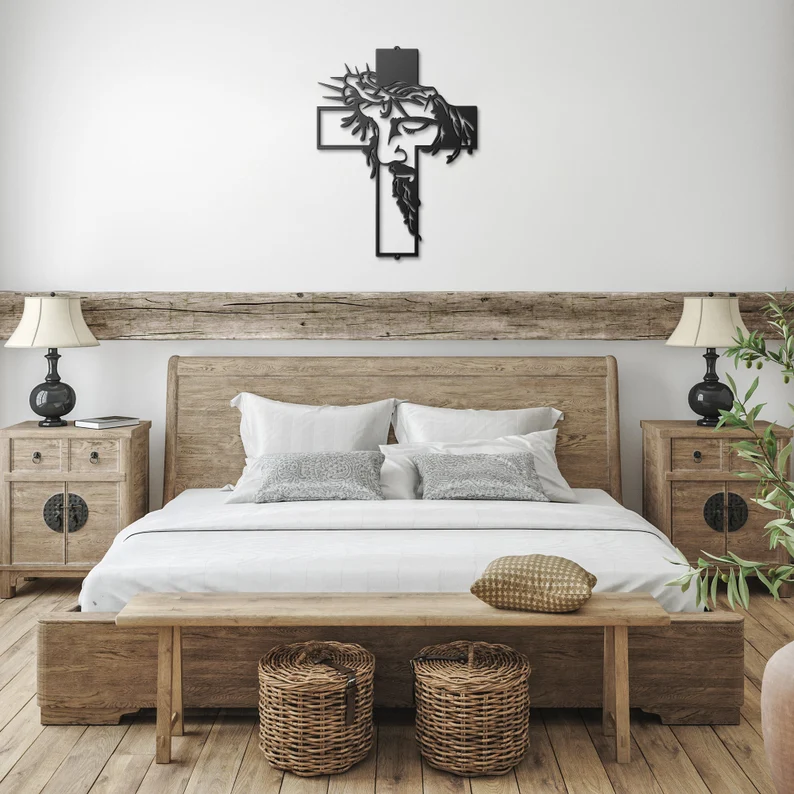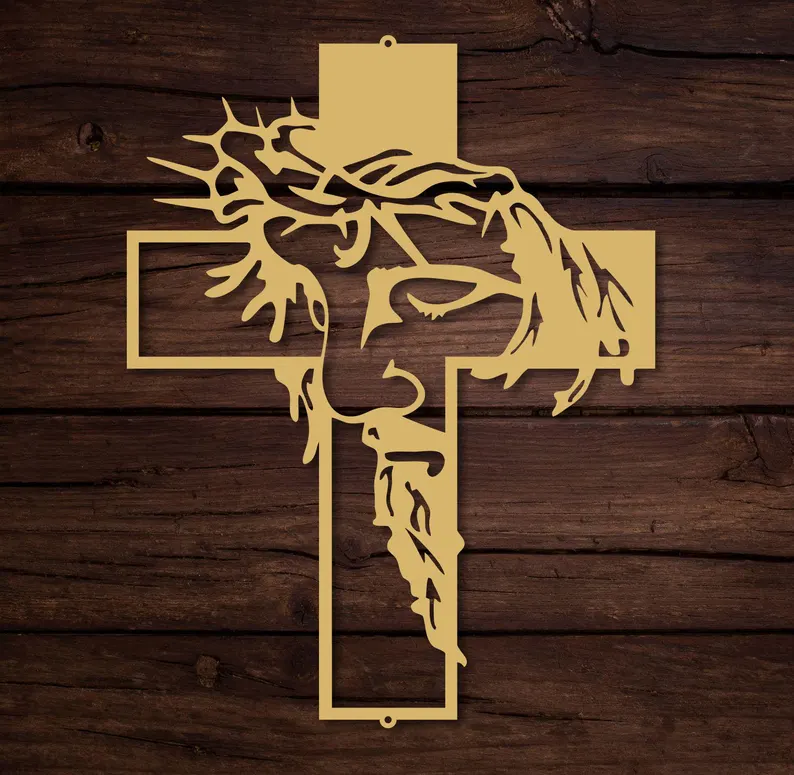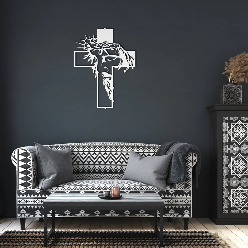 Metalowy krzyż na ścianę z twarzą Jezusa, wykonany z trwałej stali i wycinany precyzyjnie laserowo. Wyrazista, religijna dekoracja do domu, kaplicy lub miejsca modlitwy. Różne rozmiary i kolory. Darmowa wysyłka na terenie Polski.