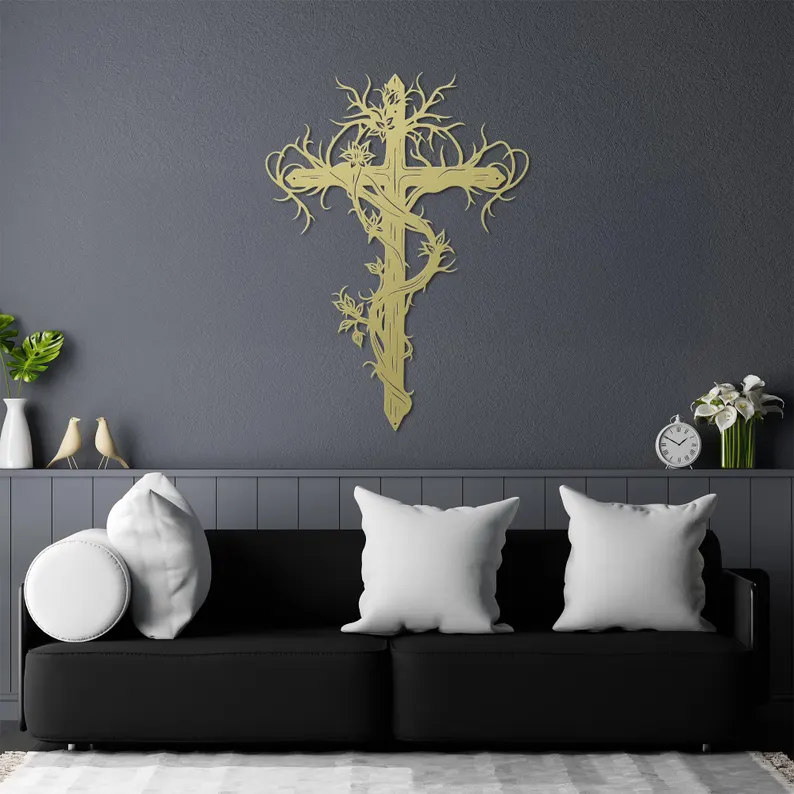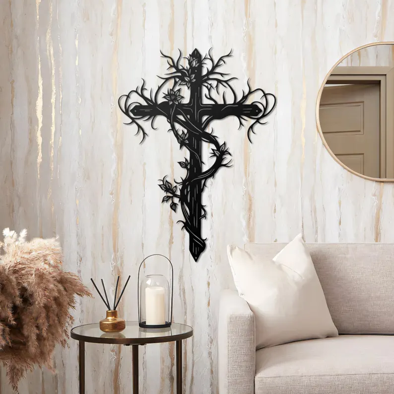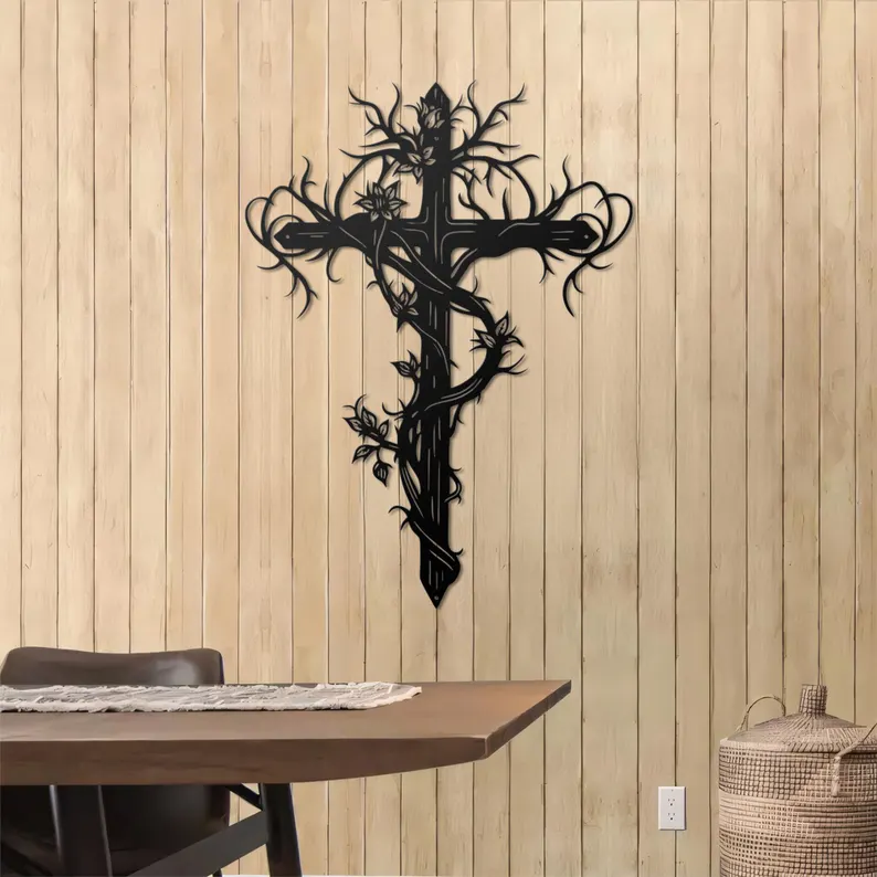 Krzyż metalowy na ścianę z dekoracyjnym motywem winorośli oplatającej ramiona krzyża. Elegancka, ażurowa dekoracja wykonana z trwałej stali, łącząca symbolikę z organiczną formą. Idealny do salonu, sypialni lub strefy wyciszenia. Darmowa wysyłka na terenie Polski.
