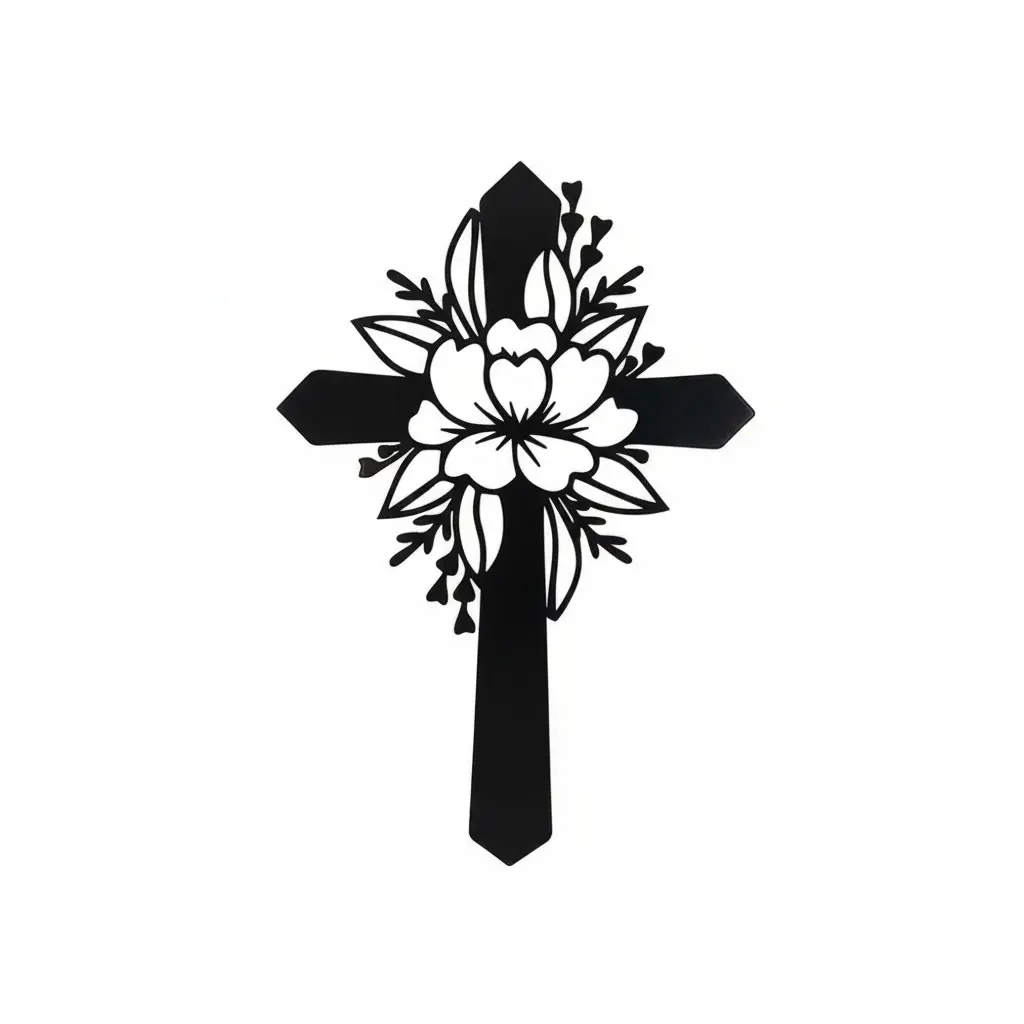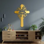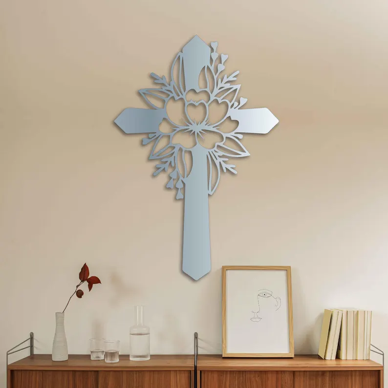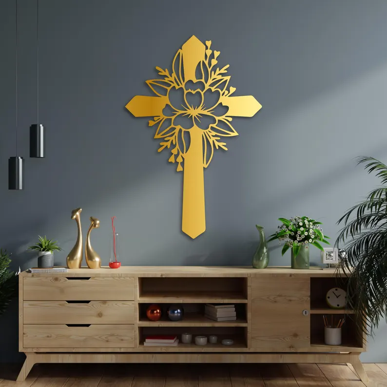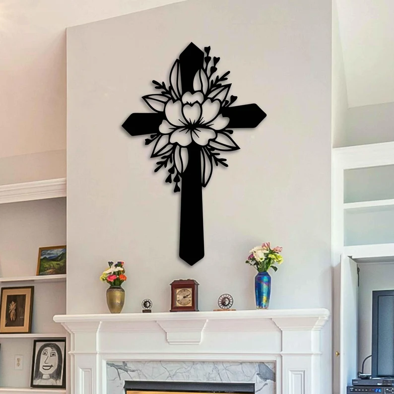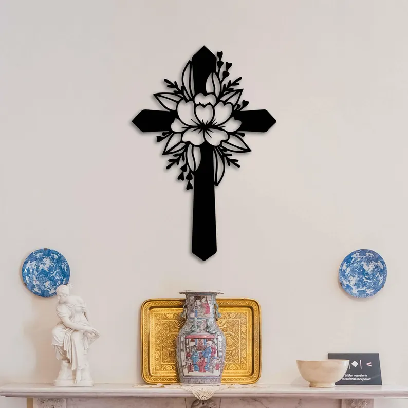 Krzyż metalowy na ścianę z motywem kwiatowym to elegancka dekoracja łącząca symbolikę wiary z delikatną formą roślinną.