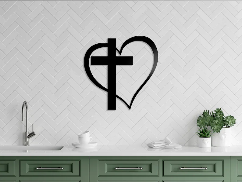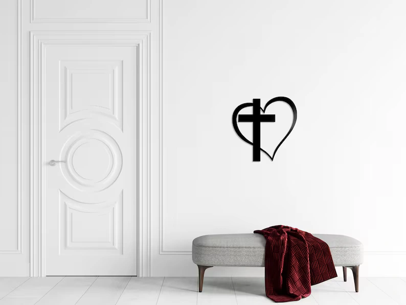 Metalowy krzyż ścienny w kształcie serca – symbol wiary, miłości i duchowej harmonii. Nowoczesna dekoracja z metalu, dostępna w kilku kolorach i rozmiarach. Idealna do domu lub jako prezent. Darmowa wysyłka na terenie Polski.