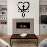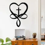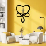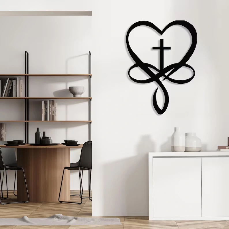 Metalowy krzyż ścienny w kształcie serca z delikatnym motywem nieskończoności i krzyża w centrum. Elegancka dekoracja do wnętrz o głębokim znaczeniu duchowym. Wykonany z trwałego metalu, dostępny w kilku kolorach i rozmiarach. Darmowa wysyłka na terenie Polski.