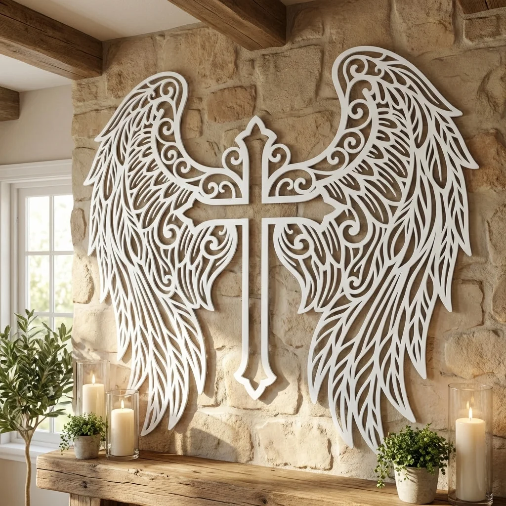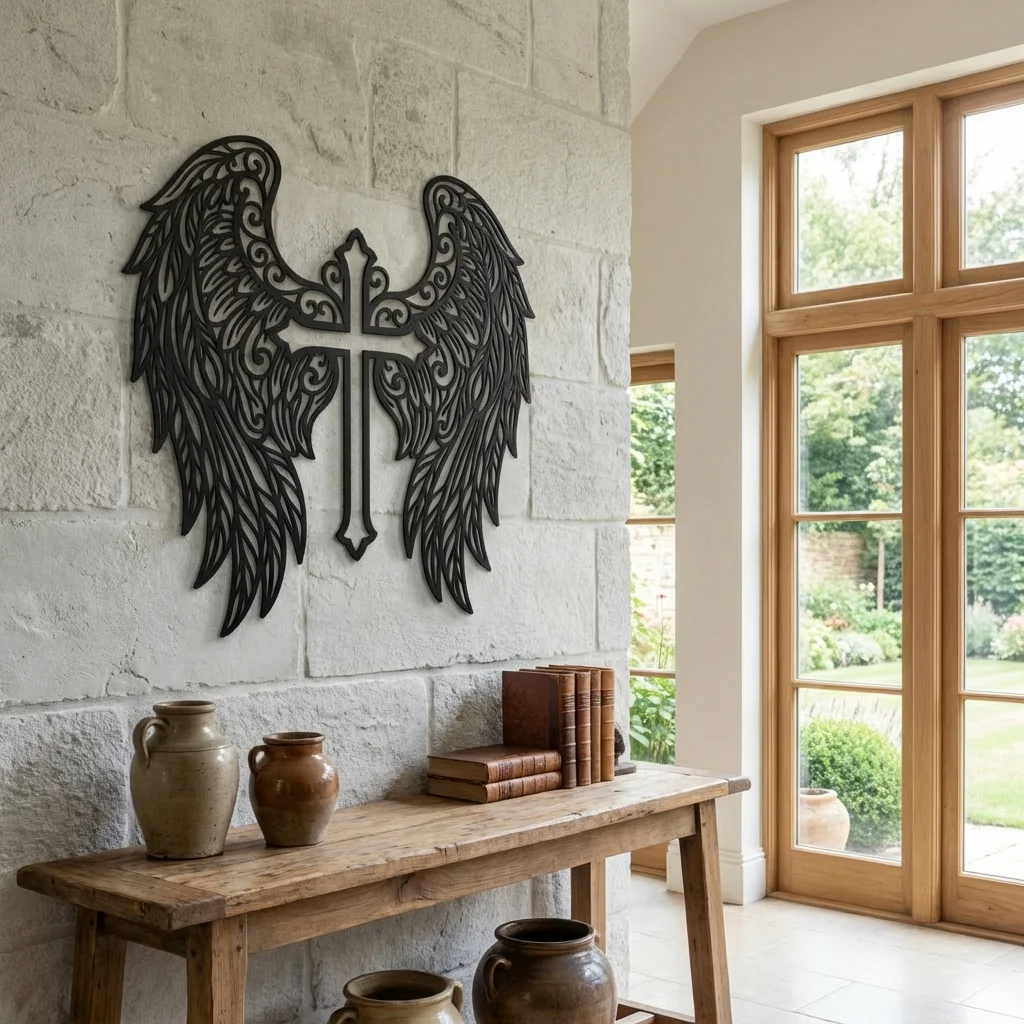 - Głęboka symbolika – połączenie krzyża i anielskich skrzydeł tworzy dekorację o wyjątkowym religijnym i ochronnym znaczeniu.