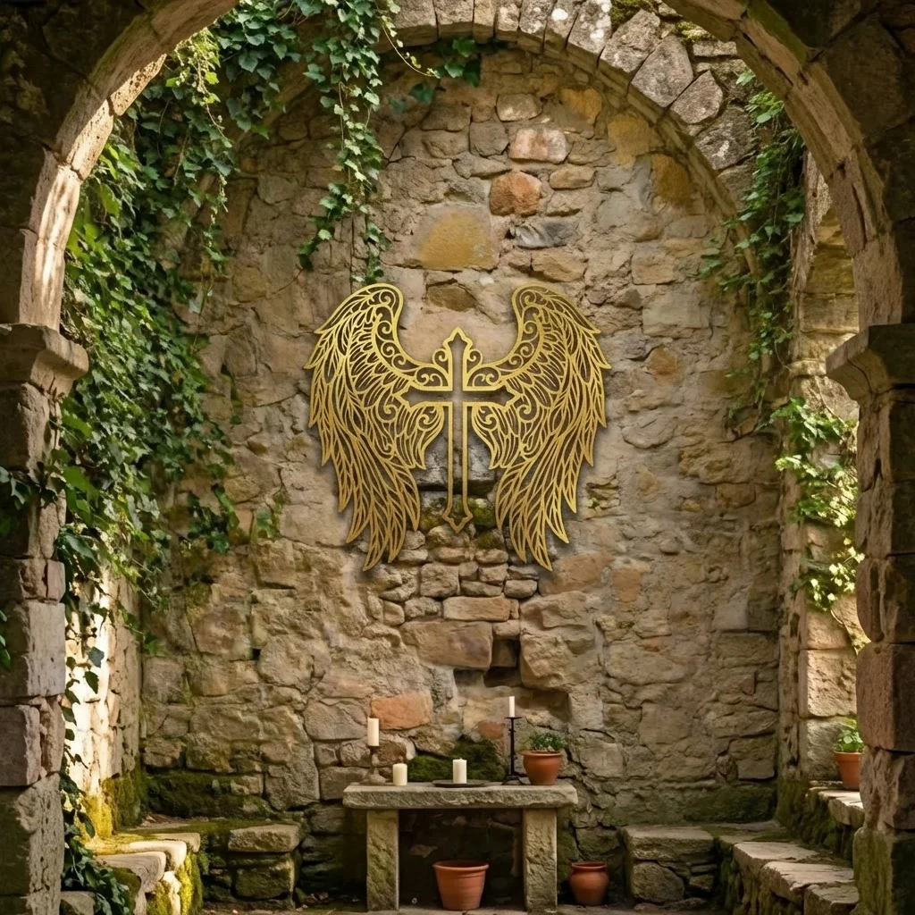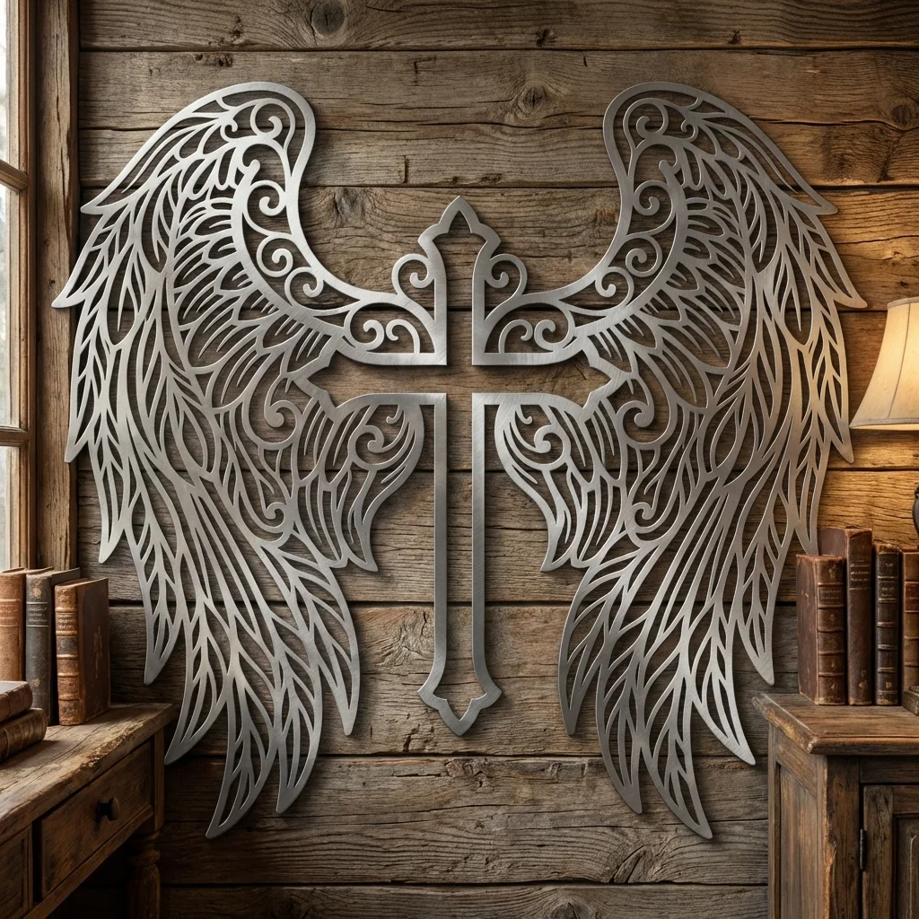 Krzyż Pod Skrzydłami Anioła – metalowa dekoracja ścienna