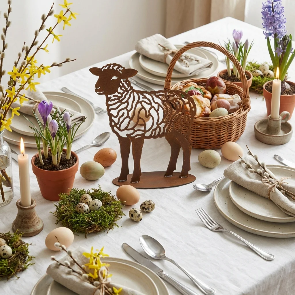 Nowoczesna, ażurowa sylwetka baranka z artystycznym wzorem linii w stylu „labiryntu”. Idealna do designerskich ogrodów, na taras lub przy wejściu do domu. Rozmiary: 9×10 cm, 14×15 cm, 18×20 cm. Warianty: corten, czarny, biały, złoty lub stal nierdzewna (polerowana/szczotkowana). Darmowa dostawa na terenie Polski.