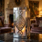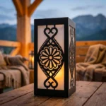 Lampion metalowy góralski – Rozeta Podhalańska to dekoracyjny lampion inspirowany tradycyjnym wzornictwem Podhala. Centralny motyw rozety w połączeniu z prostą, elegancką bryłą tworzy wyjątkowy akcent świetlny, który pięknie prezentuje się we wnętrzach, na tarasie, balkonie lub ganku. Po zapaleniu świecy lub oświetlenia LED lampion daje ciepły, przytulny efekt i podkreśla regionalny charakter aranżacji.