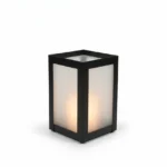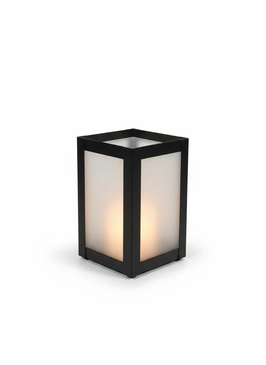 Elegancki lampion „Modern Cube” w formie prostej kostki, wykonany z czarnej, proszkowo malowanej stali i matowego szkła akrylowego. Minimalistyczny design, idealny do wnętrz i ogrodu.