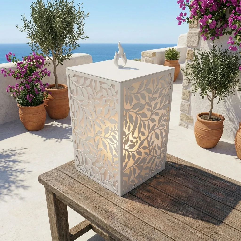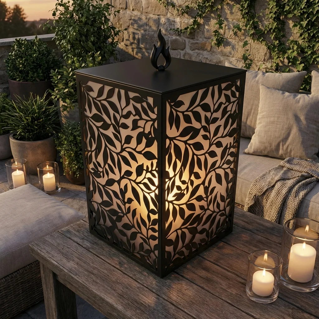 Lampion Roślinny Płomień to metalowy lampion dekoracyjny z ażurowym motywem roślinnym, który subtelnie rozprasza światło i tworzy wyjątkowo ciepły, nastrojowy klimat. Organiczny wzór inspirowany liśćmi i naturalnymi formami sprawia, że lampion pięknie prezentuje się zarówno we wnętrzach, jak i na tarasie, balkonie czy ganku.