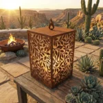 Lampion Roślinny Płomień – metalowy lampion dekoracyjny z ażurowym motywem roślinnym inspirowanym naturą. Tworzy ciepły, nastrojowy klimat we wnętrzu, na tarasie, balkonie lub ganku. Rozmiary: 20 x 10 x 10 cm, 25 x 12 x 12 cm, 30 x 15 x 15 cm. Wykończenia: Corten, czarny, biały, złoty, stal szczotkowana. Darmowa dostawa w Polsce.