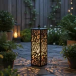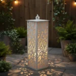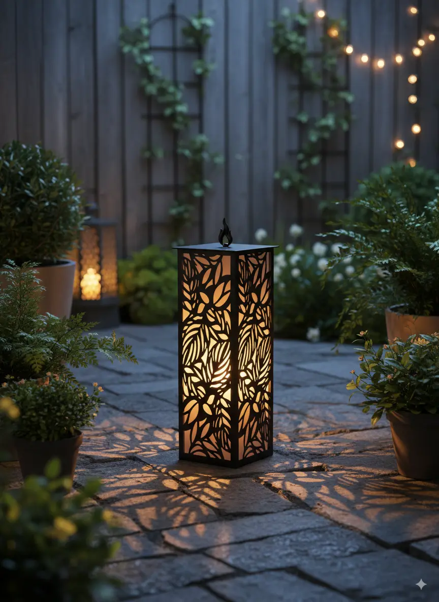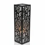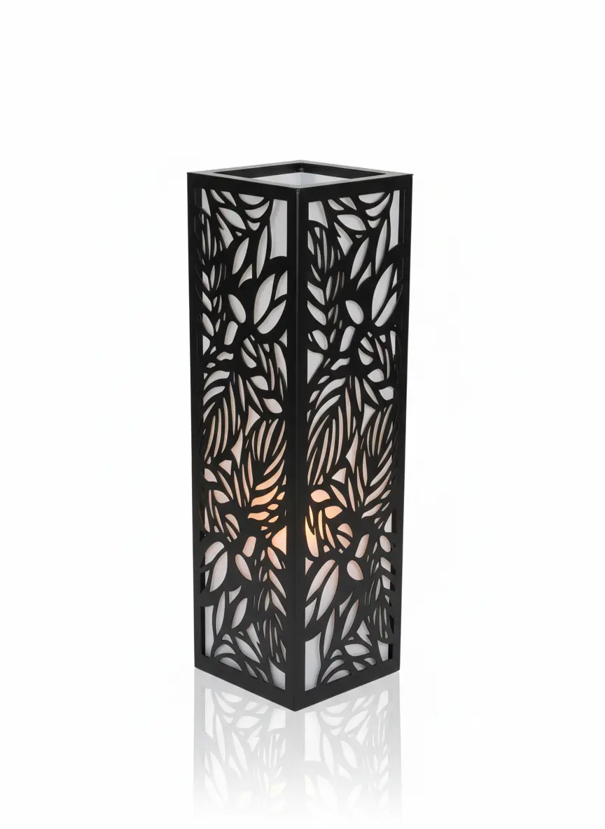 Lampion Roślinny Wieża (25×25×75 cm) to wyjątkowa dekoracja o eleganckim i nowoczesnym charakterze. Wysoka forma i ażurowy wzór liści nadają mu lekkości, a jednocześnie sprawiają, że pięknie rozprasza światło, tworząc romantyczny nastrój.