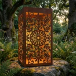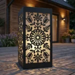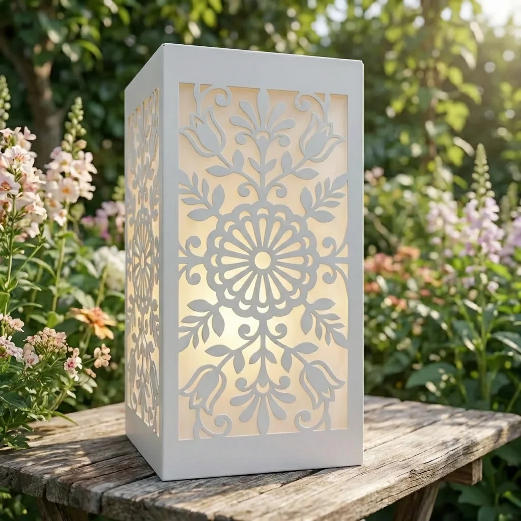 Lampion Rozeta Kwiatowa to elegancki metalowy lampion z ażurowym wzorem inspirowanym rozetą i motywem kwiatowym. Po zapaleniu światła tworzy dekoracyjny efekt i przytulny klimat na tarasie, balkonie, patio, przy wejściu do domu lub w ogrodzie.