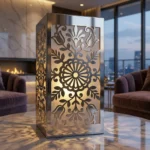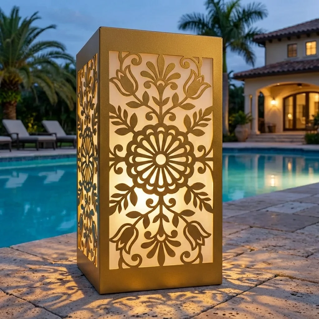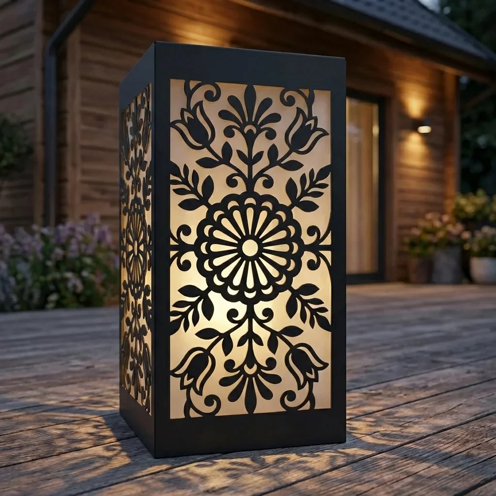 Lampion Rozeta Kwiatowa to dekoracyjny lampion metalowy z wyrazistym ażurowym wzorem inspirowanym ornamentem kwiatowym i symetryczną rozetą. Dzięki dopracowanej formie pięknie prezentuje się zarówno w dzień, jak i po zmroku, kiedy światło subtelnie wydobywa detale wzoru i tworzy nastrojowy efekt w otoczeniu.