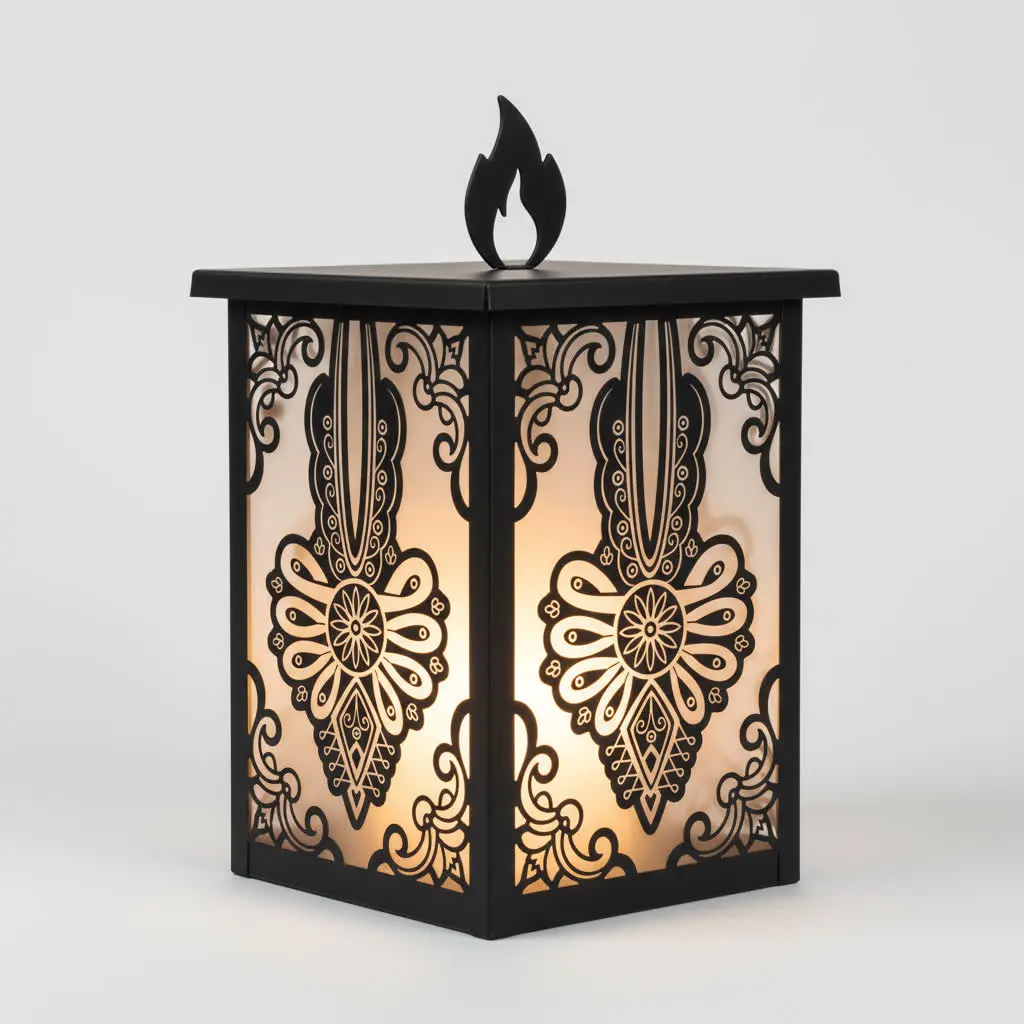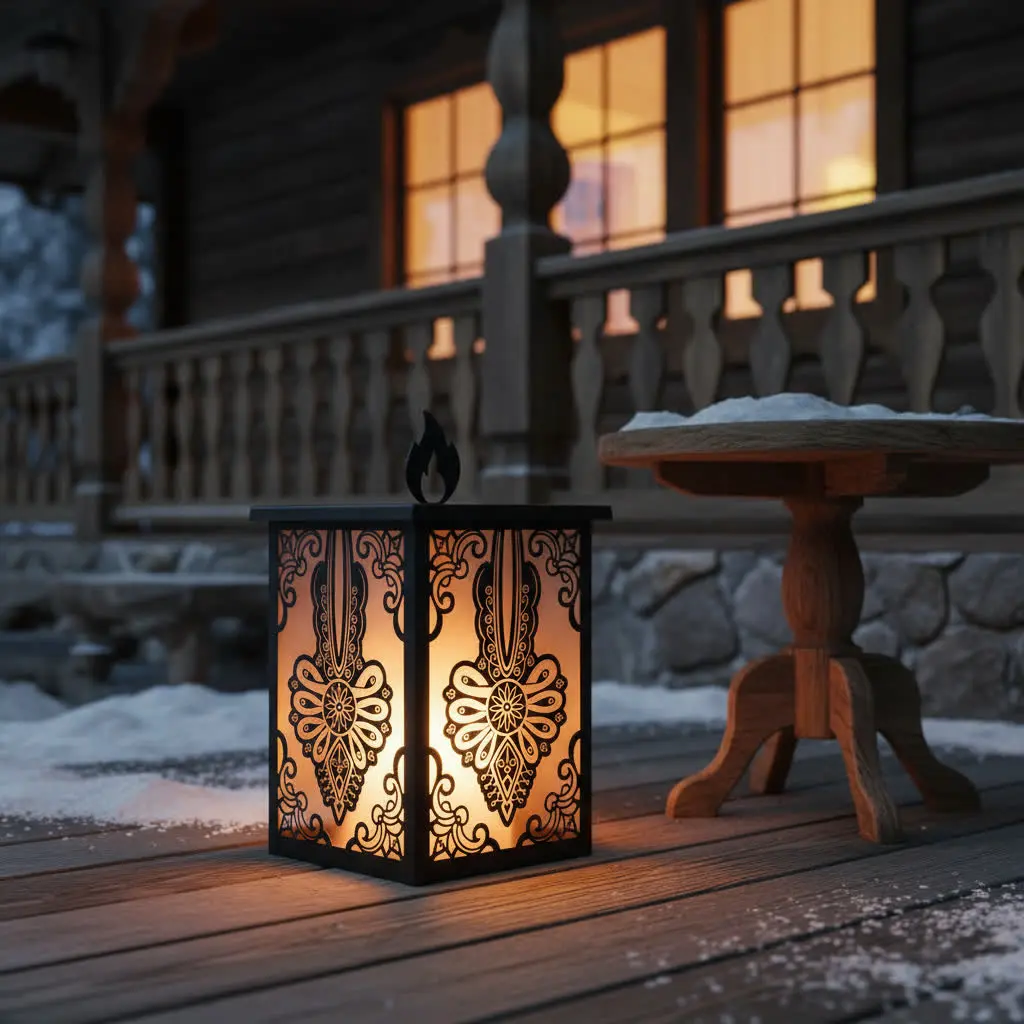 Stylowy lampion w stylu zakopiańskim z pionowym motywem parzenicy i dekoracyjnym płomieniem. Symbolizuje siłę, ciepło i ducha gór. Doskonały akcent dla tarasów, ogrodów i wnętrz inspirowanych Podhalem.