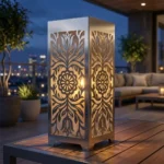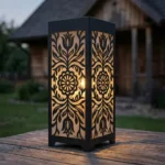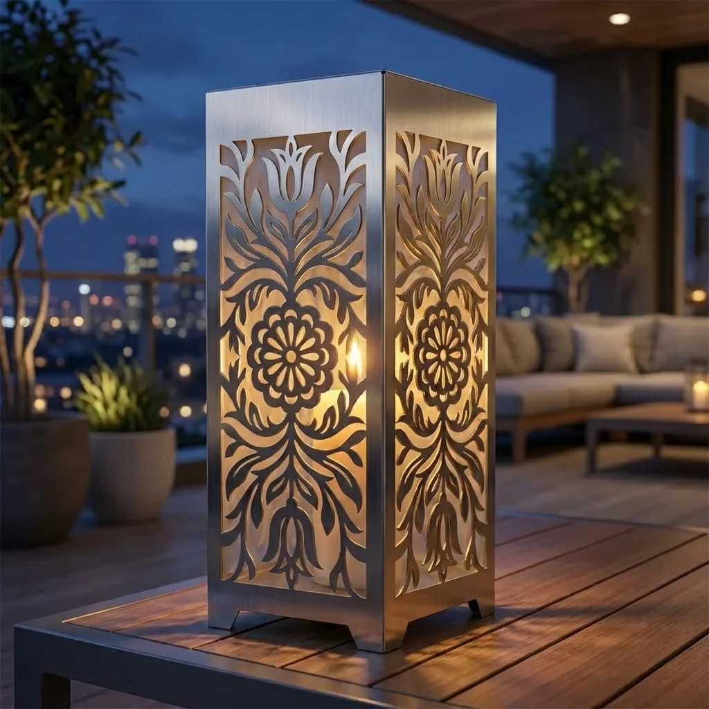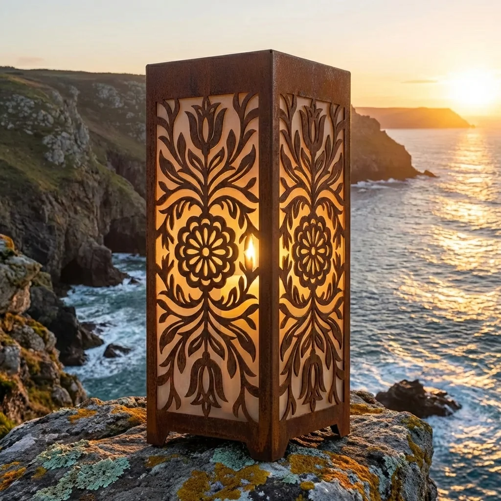 Lampion Złota Rozeta Tulipanów to elegancki metalowy lampion z ażurowym wzorem inspirowanym rozetą i tulipanowym ornamentem. Po zapaleniu światła tworzy dekoracyjny efekt i przytulny klimat na tarasie, balkonie, patio, przy wejściu do domu lub w ogrodzie.