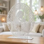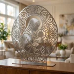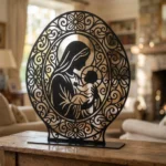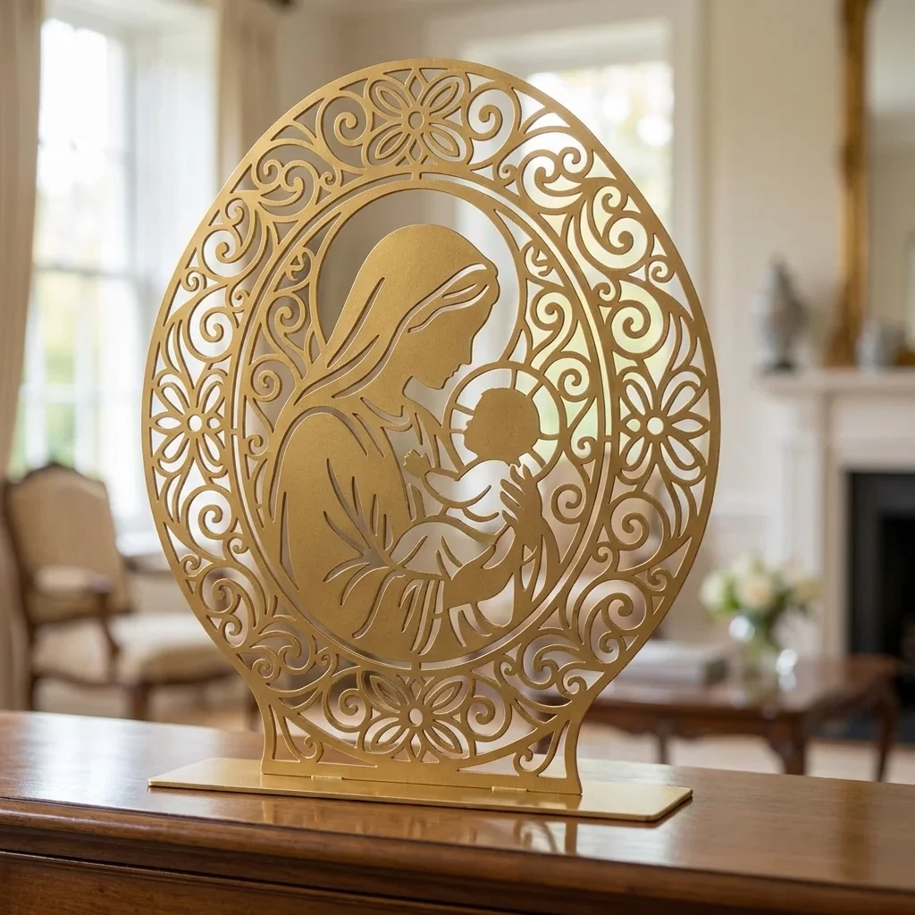 Madonna z Dzieciątkiem Ornament – metalowa dekoracja wolnostojąca to elegancka ozdoba sakralna, która łączy klasyczny motyw Madonny z Dzieciątkiem z dekoracyjną, ażurową oprawą. Ozdobna rama z ornamentami nadaje całości wyjątkowego charakteru i sprawia, że dekoracja pięknie prezentuje się na komodzie, konsoli, półce lub w domowym kąciku modlitwy.