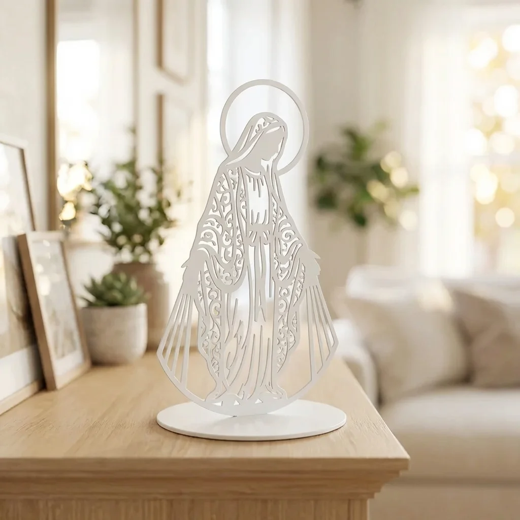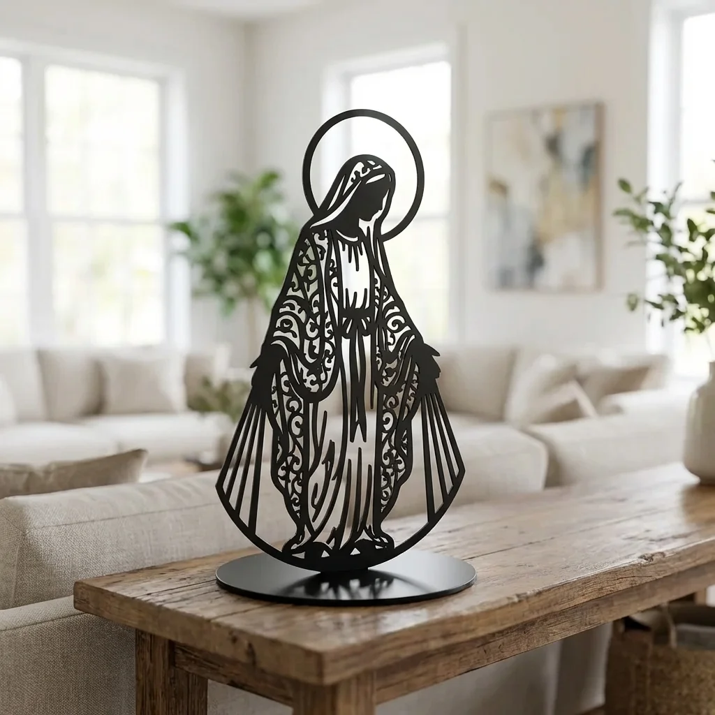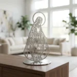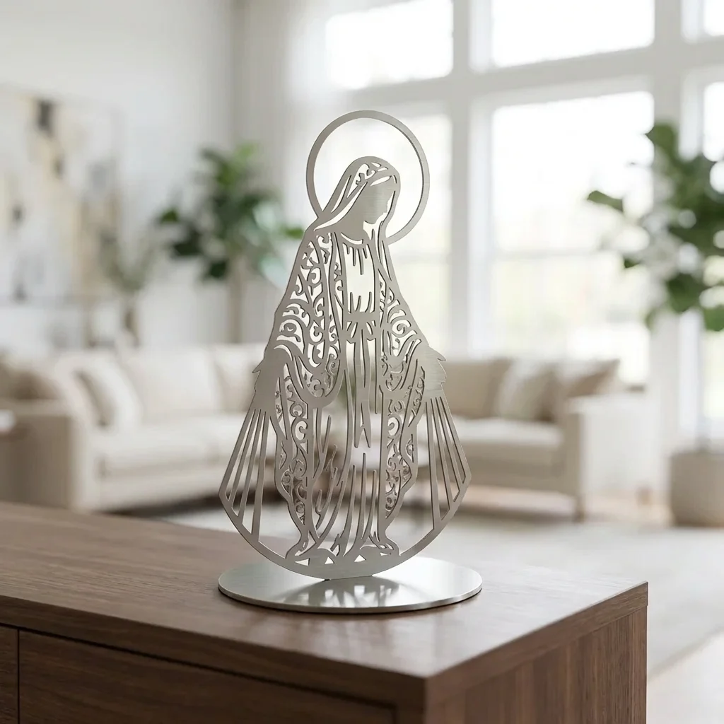 Matka Łaski – metalowa dekoracja wolnostojąca to subtelna ozdoba sakralna, która łączy spokojny, pełen łagodności motyw z elegancką metalową formą. Smukła sylwetka i delikatne detale sprawiają, że dekoracja pięknie prezentuje się na komodzie, półce, konsoli lub w domowym kąciku modlitwy, wprowadzając do wnętrza harmonię i duchowy charakter.