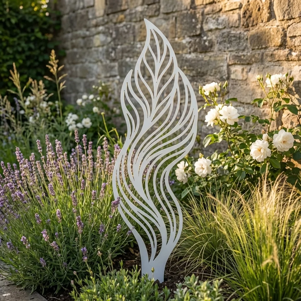 Metalowa dekoracja ogrodowa do wbicia kwiat Płomień Natury to nowoczesna, ażurowa forma inspirowana liściem i płomienną linią ruchu. Organiczny wzór pięknie podkreśla rabaty, kamienne aranżacje i strefy przy ścieżkach, tworząc efektowne światło-cienie oraz wrażenie „żywej” kompozycji w ogrodzie.