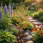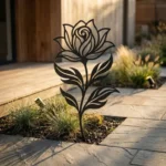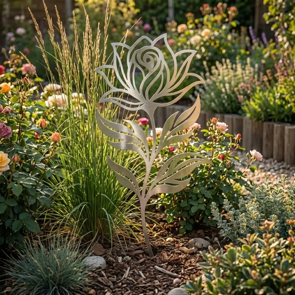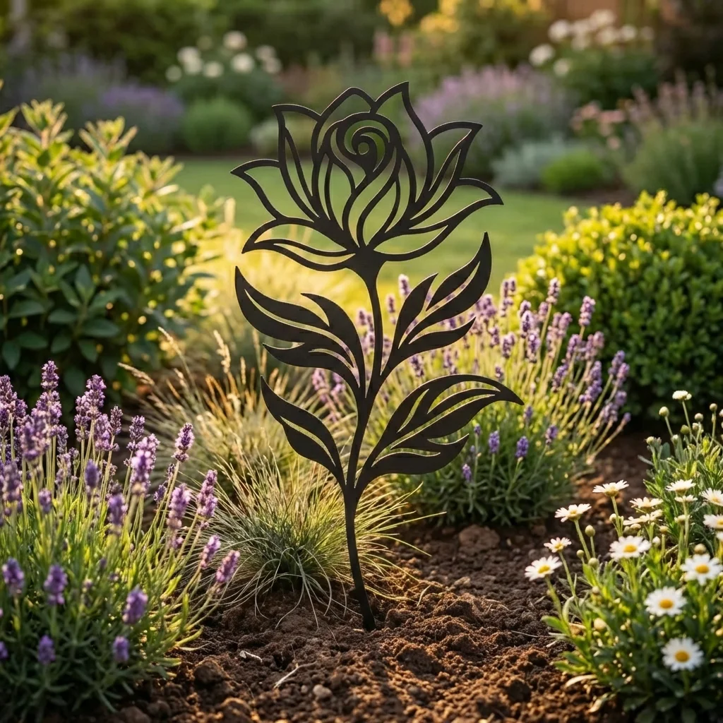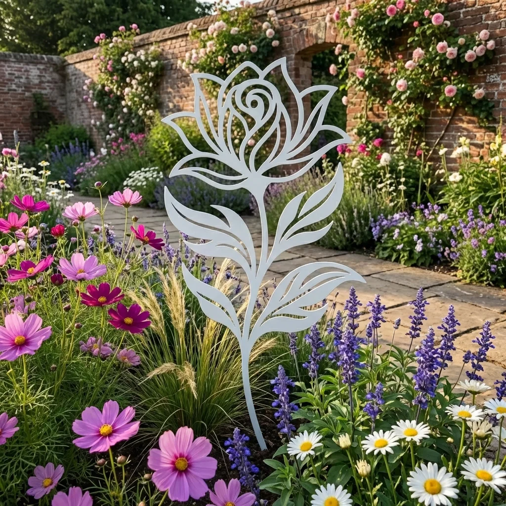 - Metalowa dekoracja ogrodowa do wbicia kwiat – stabilna forma idealna do rabat, trawników i stref wejściowych.