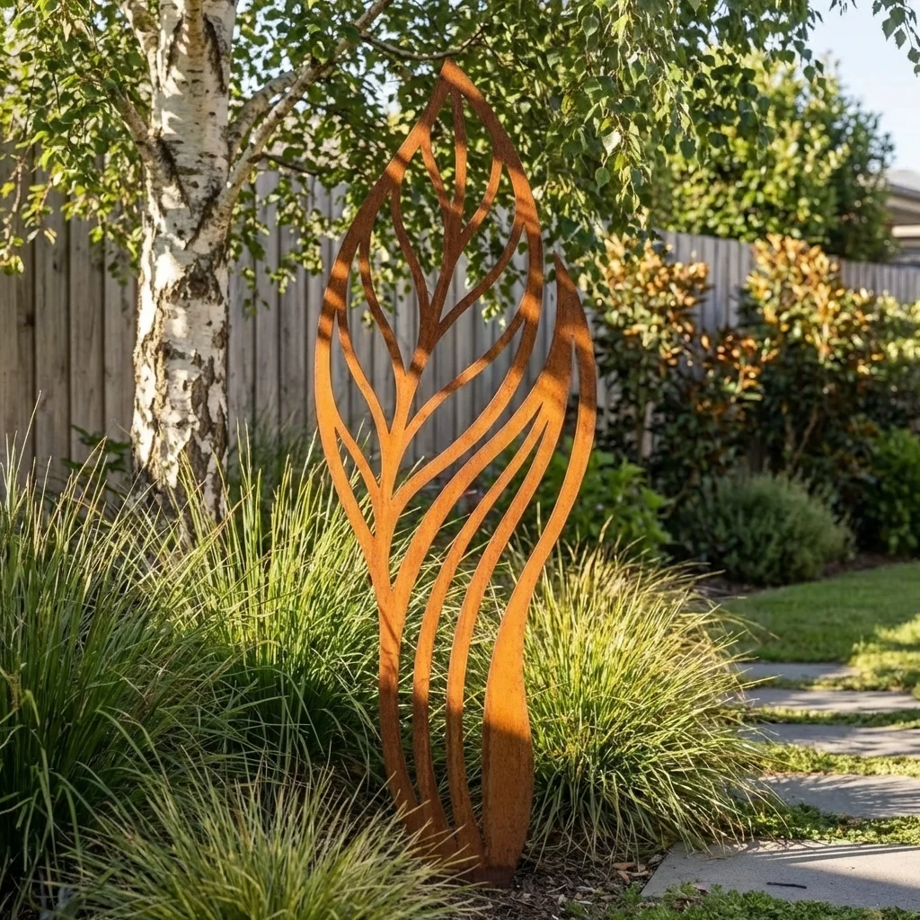 Rytm Architektury to metalowa dekoracja ogrodowa do wbicia w ziemię o nowoczesnym, ażurowym wzorze inspirowanym formą liścia i architekturą. Idealna do ścieżek, rabat i stref wejściowych. Dostępna w stali Corten, wersji malowanej proszkowo oraz stali nierdzewnej. Darmowa dostawa na terenie Polski.