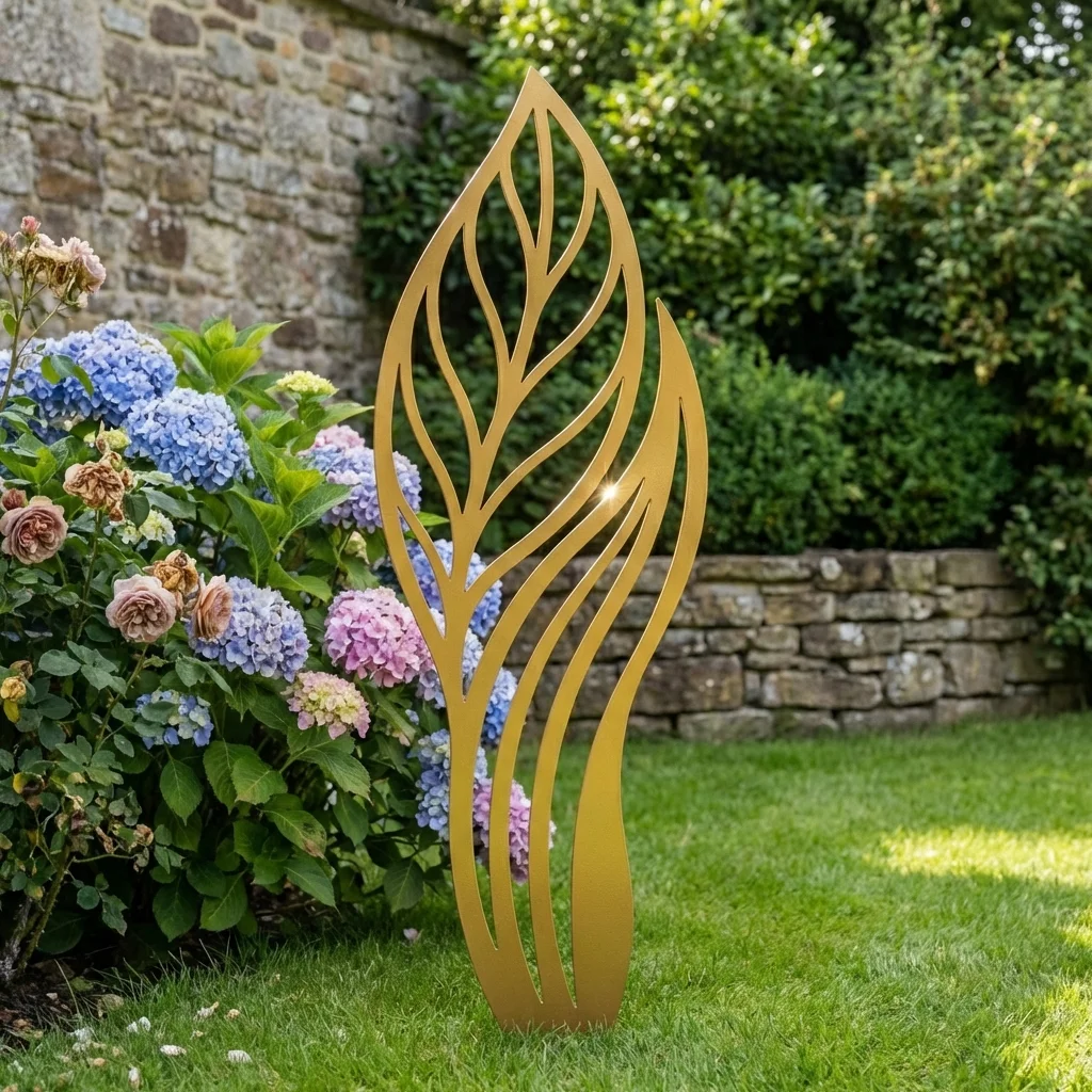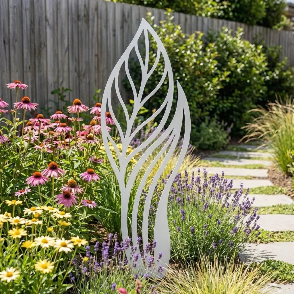Metalowa dekoracja ogrodowa do wbicia Rytm Architektury to nowoczesna, ażurowa forma inspirowana linią architektoniczną i organicznym kształtem liścia. Smukły, pionowy monolit wprowadza do ogrodu wrażenie porządku, rytmu i nowoczesnej elegancji, doskonale komponując się z betonem, drewnem i roślinami ozdobnymi.