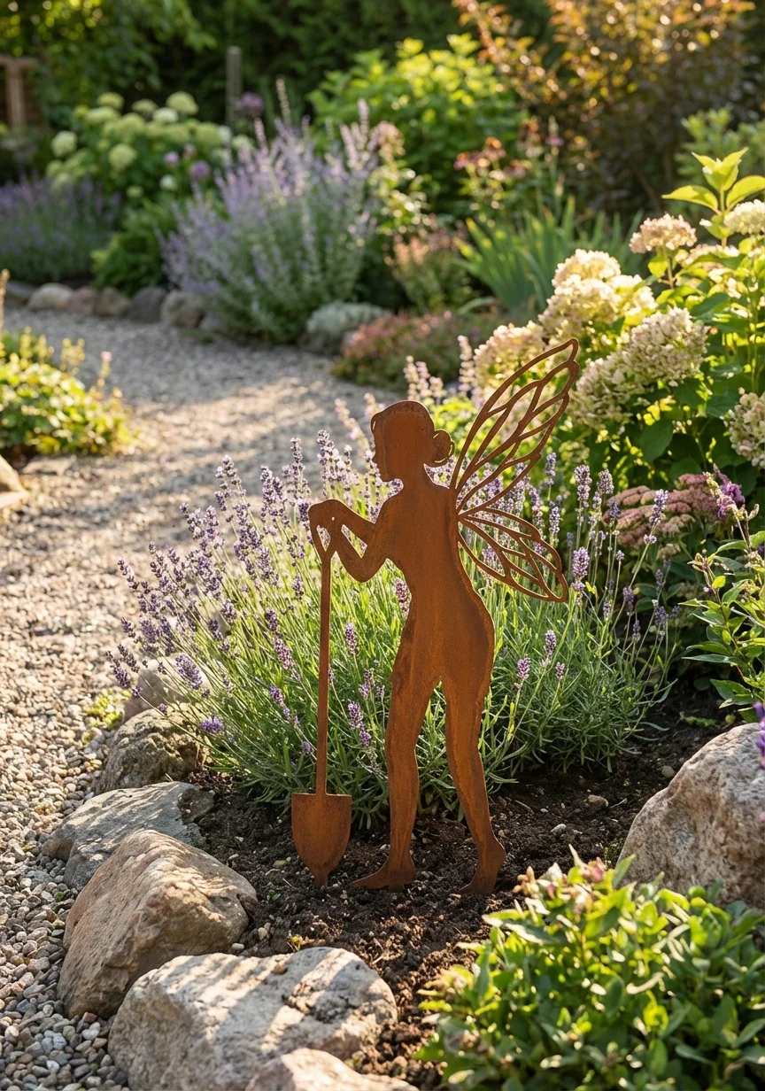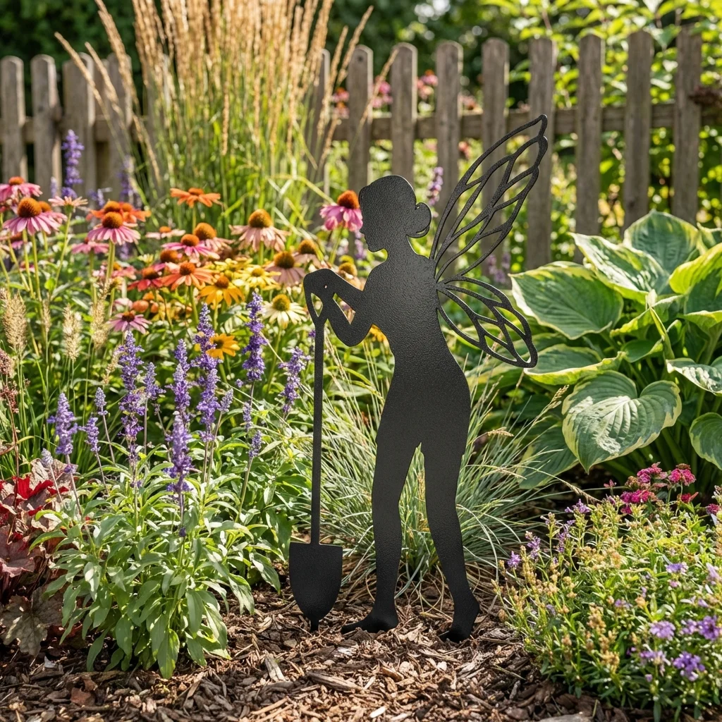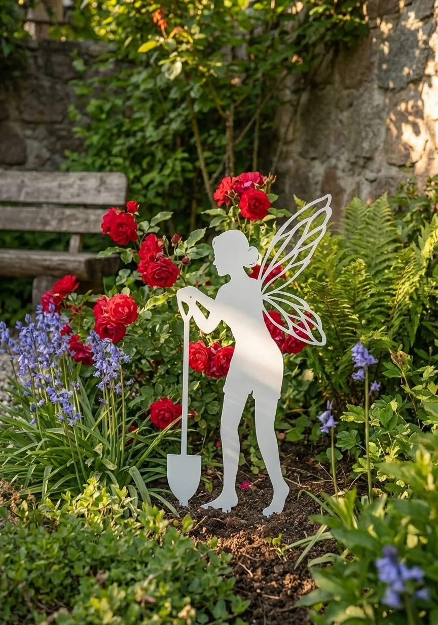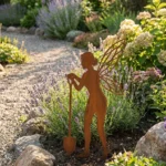Metalowa dekoracja ogrodowa do wbicia „Wróżka z Łopatką” to bajkowa sylwetka wróżki ze skrzydłami i ogrodową łopatką, która wnosi do rabat i trawnika odrobinę magii. Smukła forma i precyzyjnie wycięta stal sprawiają, że dekoracja wygląda jak mała ogrodowa rzeźba – przyciąga wzrok i pięknie komponuje się z lawendą, bylinami oraz roślinami ozdobnymi.