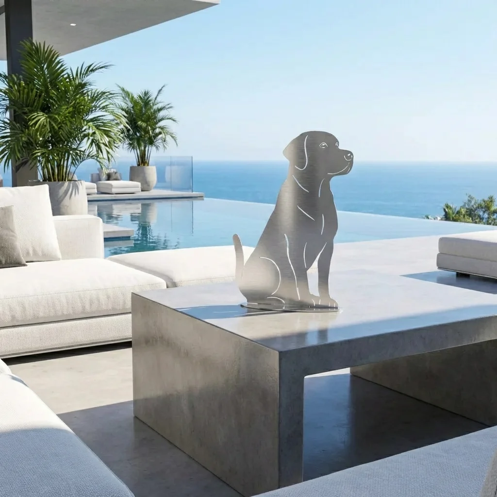 Wolnostojąca metalowa dekoracja ogrodowa w kształcie psa – wycinana laserowo, z dopracowanymi detalami. Idealna przy wejściu do domu, na taras lub wśród traw ozdobnych. Dostępne rozmiary: 13×20 cm, 20×30 cm, 26×40 cm. Wykonanie: corten (rdzawy), czarny, biały, złoty lub stal nierdzewna (polerowana/szczotkowana). Darmowa dostawa na terenie Polski.