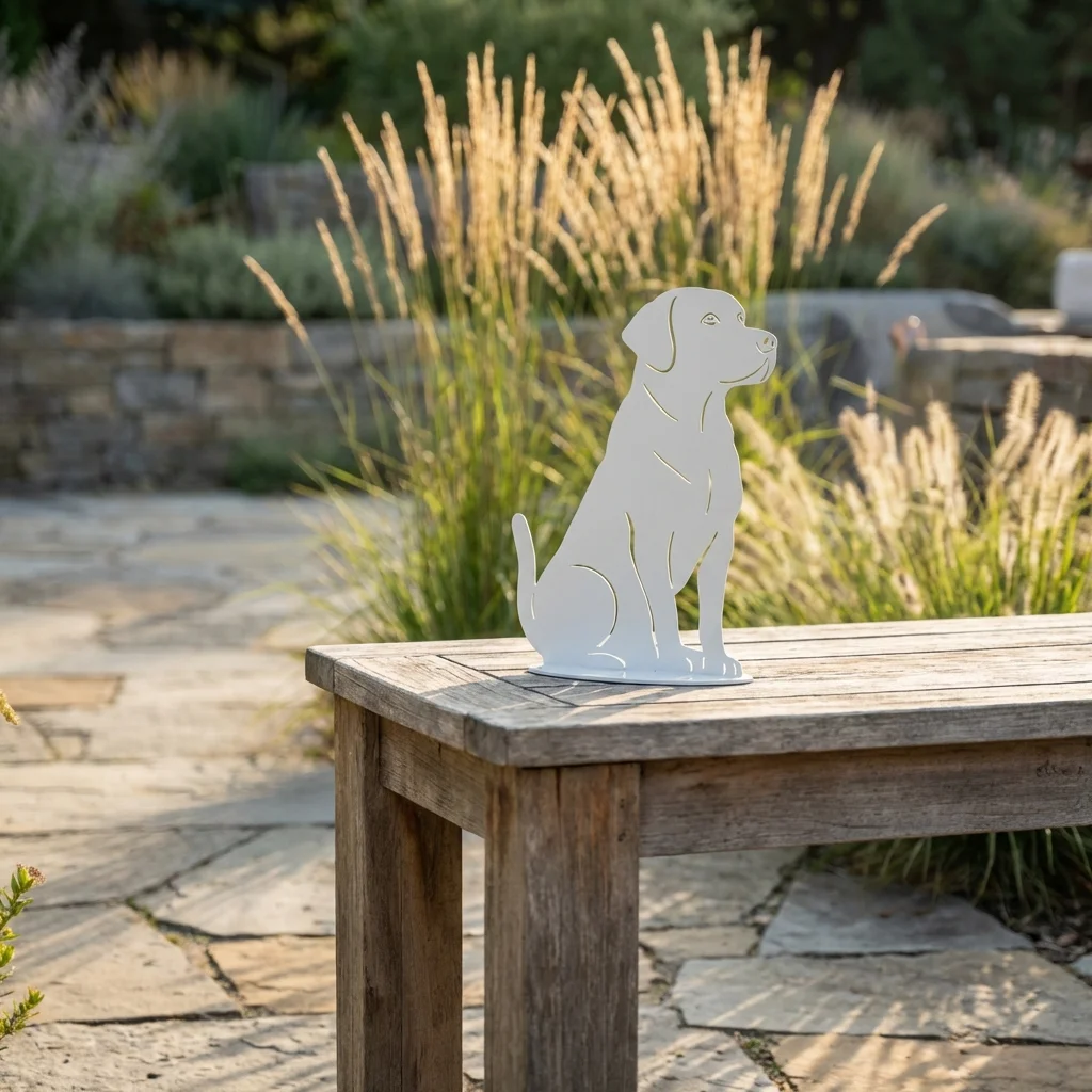 Metalowa Dekoracja Ogrodowa Pies to minimalistyczna, a jednocześnie bardzo „ciepła” w odbiorze ozdoba do ogrodu, tarasu lub podjazdu. Sylwetka psa została wycięta laserowo z metalu i osadzona na stabilnej podstawie, dzięki czemu świetnie prezentuje się wśród traw ozdobnych, przy ścieżkach, na rabatach lub przy wejściu do domu.
