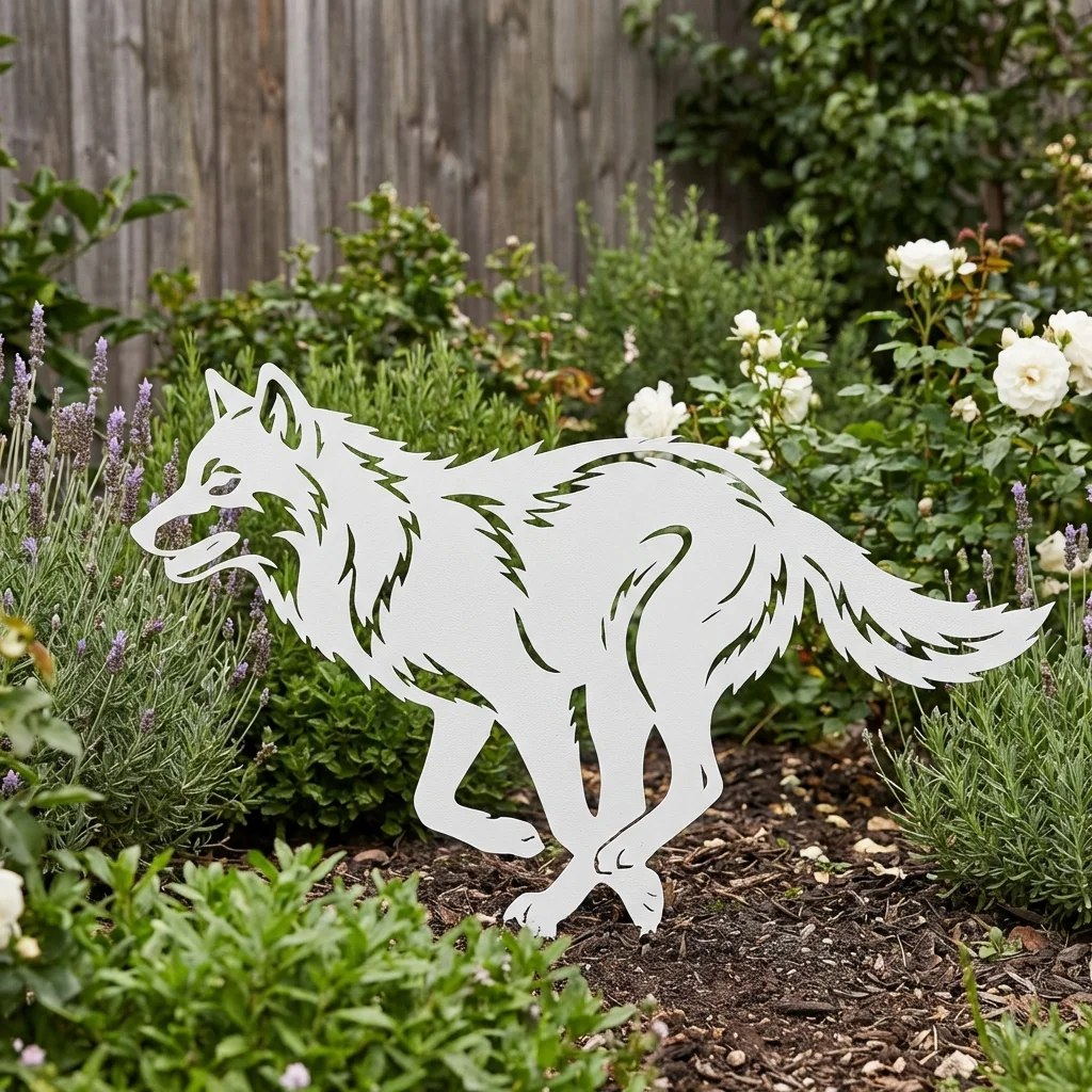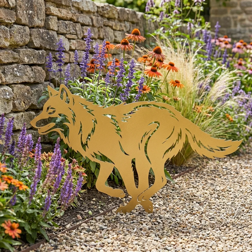 Metalowa dekoracja ogrodowa w formie wilka do wbicia w ziemię. Dynamiczna sylwetka wilka w biegu, trwała stal i odporność na warunki atmosferyczne. Dostępna w wykończeniach: corten, czarny, biały, złoty oraz stal polerowana lub szczotkowana. Stabilne szpilki i darmowa wysyłka na terenie Polski.