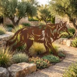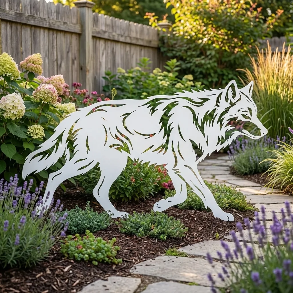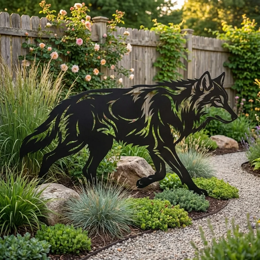 Wilk Leśny Wędrowiec przyciąga wzrok dynamiczną sylwetką i dodaje aranżacji głębi. Ażurowa forma tworzy dekoracyjne cienie, dzięki czemu ozdoba wygląda efektownie zarówno w pełnym słońcu, jak i przy delikatnym oświetleniu ogrodu.