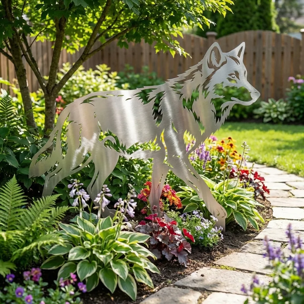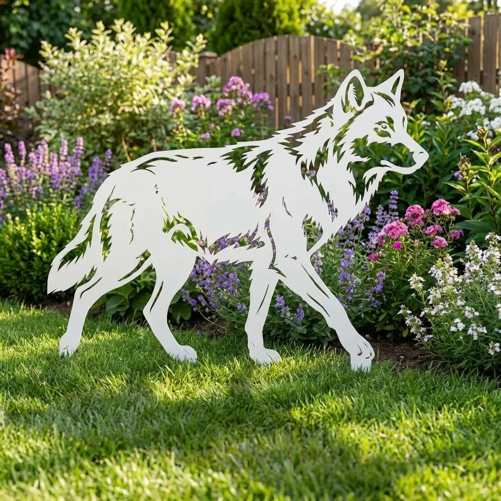 Metalowa dekoracja ogrodowa w formie wilka do wbicia w ziemię. Ażurowa sylwetka, trwała stal i odporność na warunki atmosferyczne. Dostępna w wykończeniach: corten, czarny, biały, złoty oraz stal polerowana lub szczotkowana. Stabilne szpilki i darmowa wysyłka na terenie Polski.