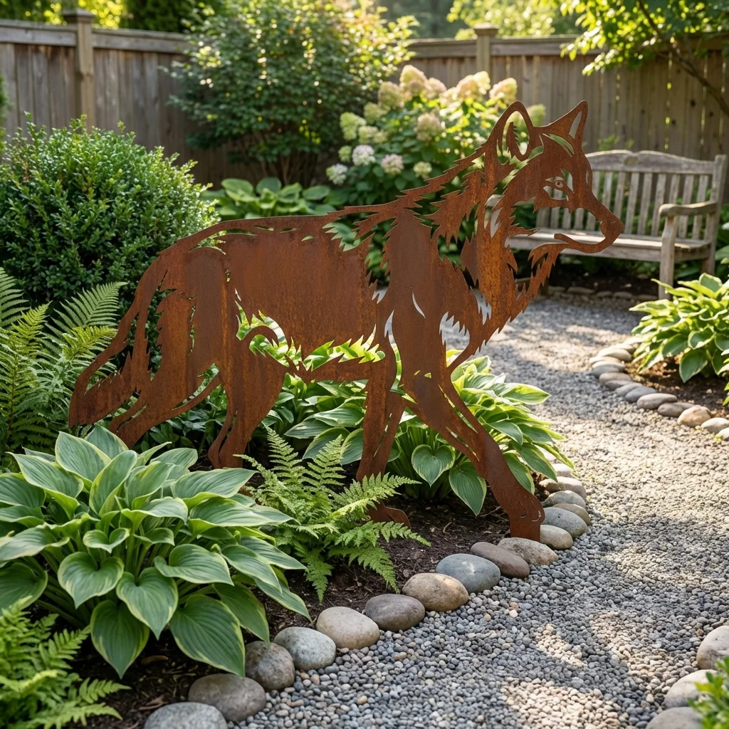 Wilk Strażnik Lasu to mocny, ale elegancki akcent w ogrodzie. Ażurowa sylwetka tworzy dekoracyjne cienie i dobrze komponuje się z zielenią, kamieniem oraz drewnem. Świetnie wygląda solo, a także w zestawie z innymi leśnymi sylwetkami.