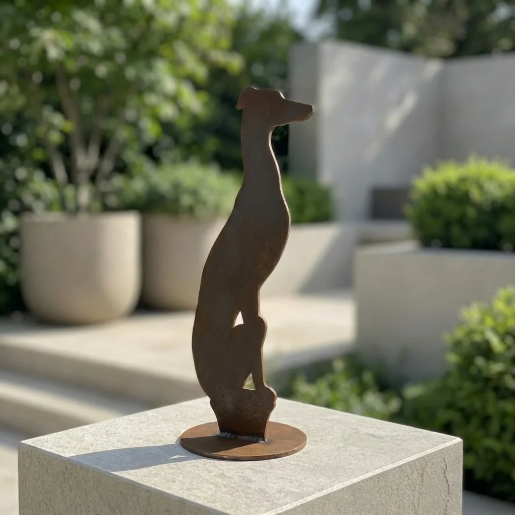 Minimalistyczna, wolnostojąca rzeźba metalowa w formie sylwetki psa na stabilnej okrągłej podstawie. Idealna na taras, do ogrodu (w osłoniętym miejscu) i do wnętrz. Dostępne rozmiary: 5,5×15 cm, 7×20 cm, 9×25 cm. Wykonanie: corten (rdzawy), czarny, biały, złoty lub stal nierdzewna szczotkowana. Darmowa dostawa na terenie Polski.