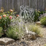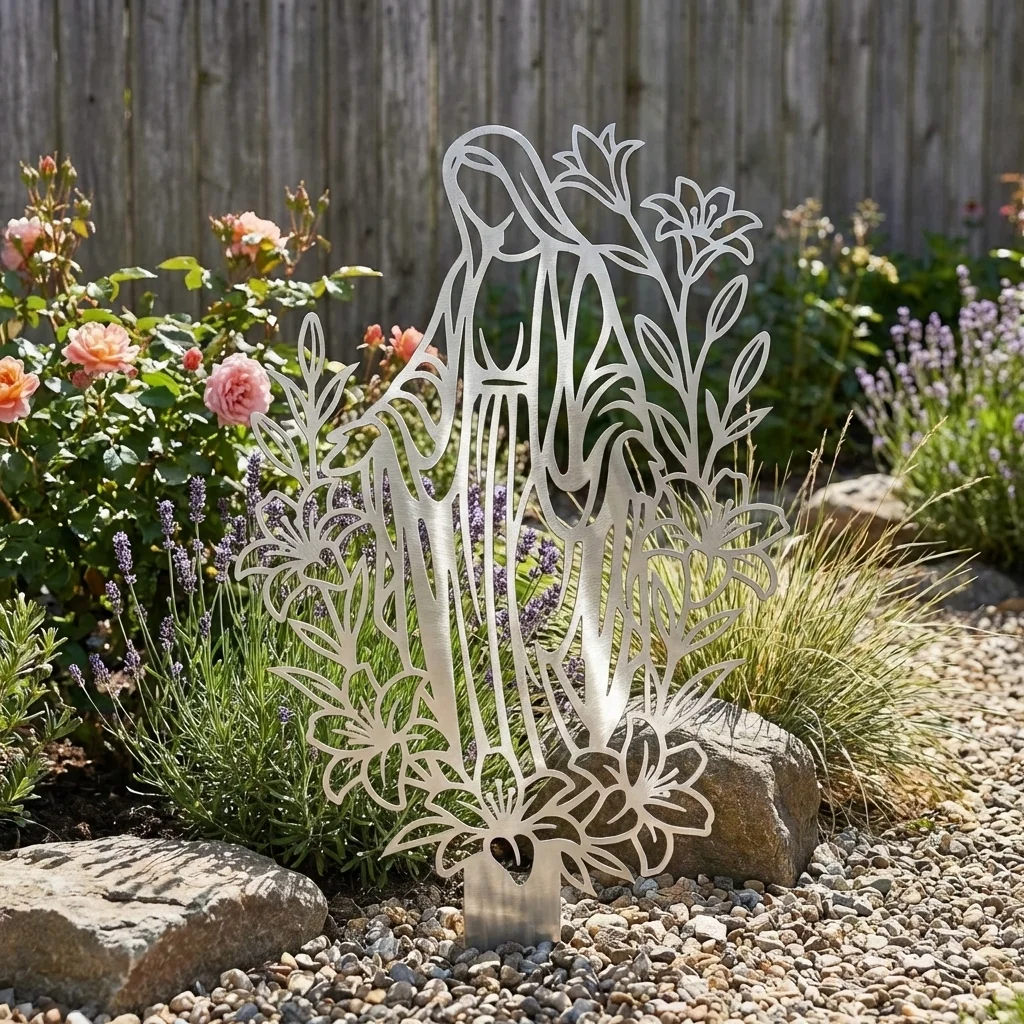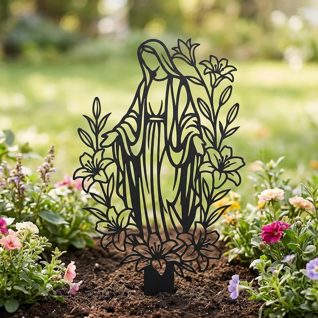 Metalowa Matka Boża do ogrodu „Matka Boża Kwiatów Ogrodowa” to subtelna i elegancka dekoracja sakralna, która pięknie prezentuje się wśród kwiatów, przy ścieżce, obok tarasu lub w spokojnym zakątku zieleni. Ta metalowa Matka Boża do ogrodu łączy delikatną, ażurową formę z motywem roślinnym, tworząc wyjątkową ozdobę pełną harmonii, łagodności i symbolicznego znaczenia.