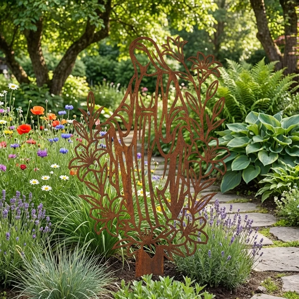 Matka Boża Kwiatów Ogrodowa – metalowa dekoracja do ogrodu