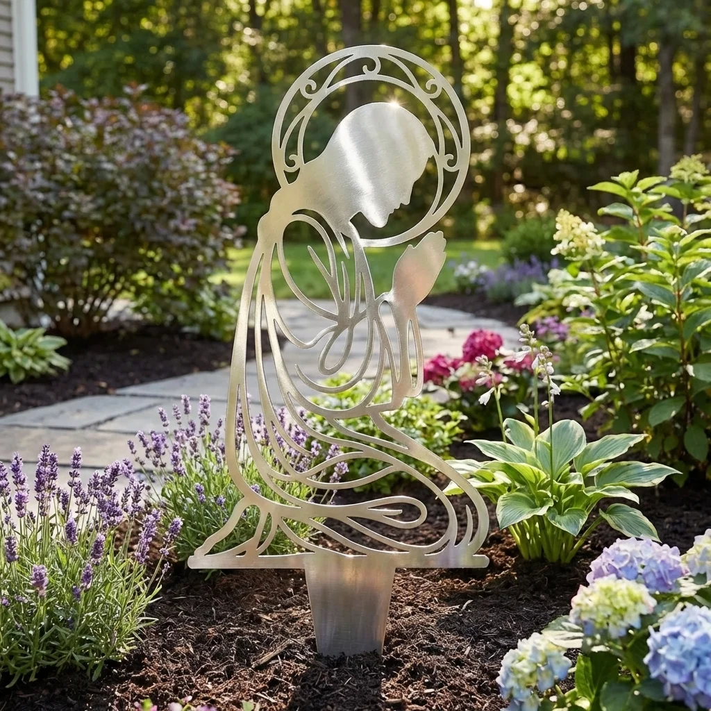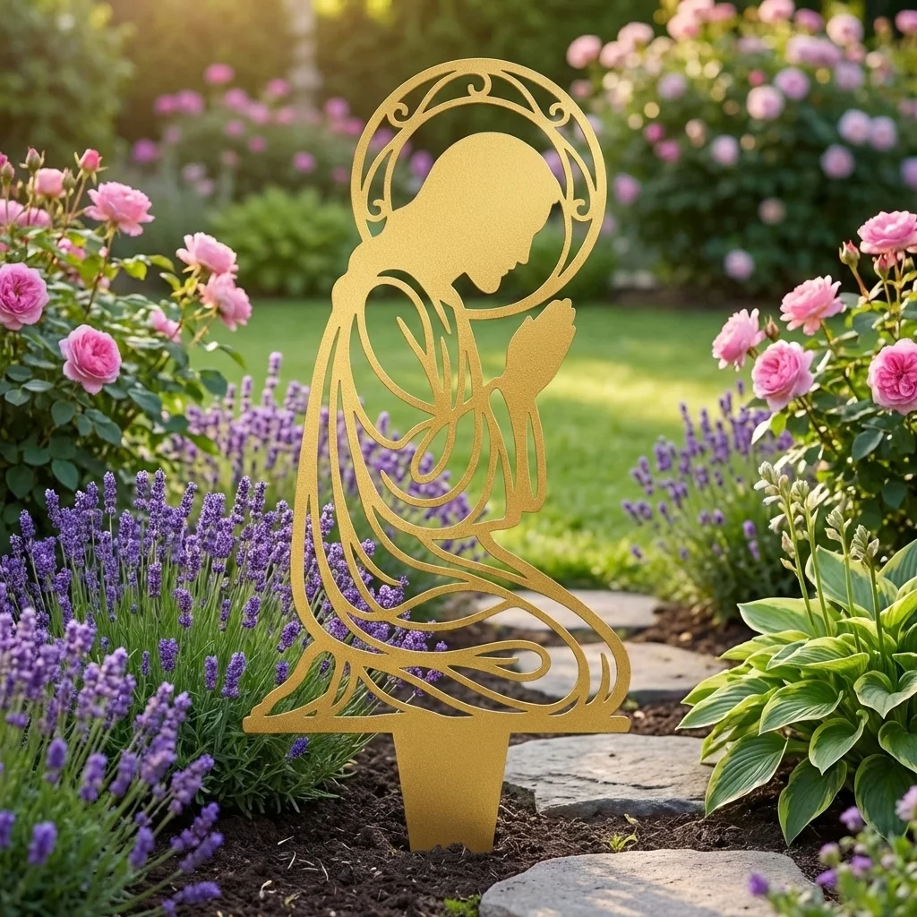 Metalowa Matka Boża do ogrodu „Matka Boża Modlitwy Ogrodowa” to subtelna i elegancka dekoracja sakralna, która pięknie prezentuje się wśród kwiatów, przy ścieżce, obok tarasu lub w spokojnym zakątku zieleni. Ta metalowa Matka Boża do ogrodu ukazuje motyw modlitwy i skupienia, dzięki czemu wnosi do przestrzeni harmonię, ciszę i symboliczny spokój.