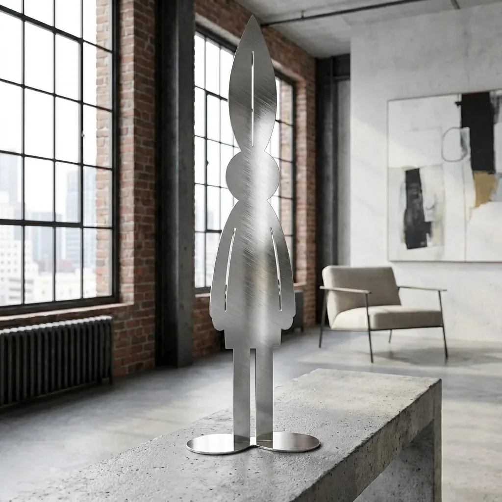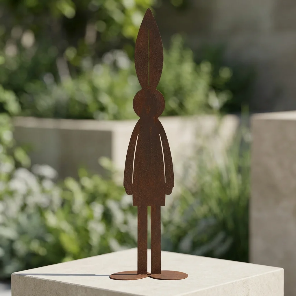 Metalowa rzeźba wolnostojąca zając „Zając Strażnik” to minimalistyczna, wysoka dekoracja o smukłej sylwetce, która wygląda jak nowoczesna figura z galerii designu. Świetnie sprawdzi się jako mocny akcent przy wejściu, na tarasie, w ogrodzie oraz w nowoczesnych wnętrzach – szczególnie w aranżacjach loft, skandynawskich i naturalnych.