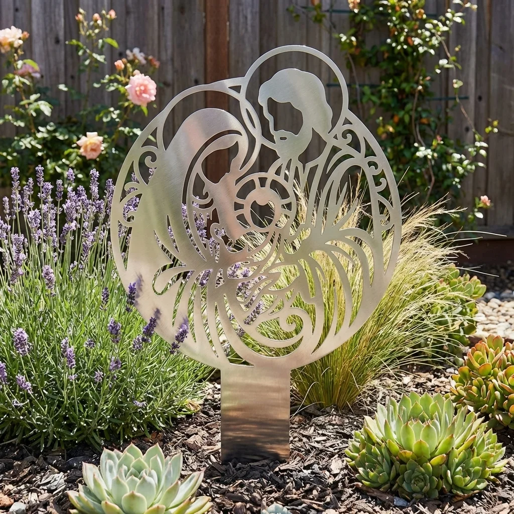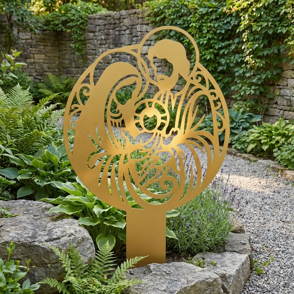 Metalowa Święta Rodzina do ogrodu „Święta Rodzina Ogrodowa Harmonia” to elegancka dekoracja sakralna, która pięknie prezentuje się wśród kwiatów, przy ścieżce, obok tarasu lub w spokojnym zakątku zieleni. Ta metalowa Święta Rodzina do ogrodu łączy symbolikę bliskości, rodzinnego ciepła i duchowej harmonii z delikatną, ażurową formą zamkniętą w subtelnej, dekoracyjnej kompozycji.
