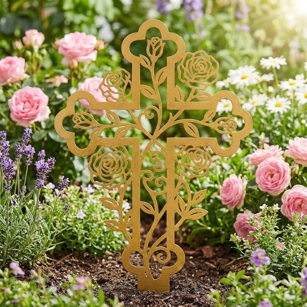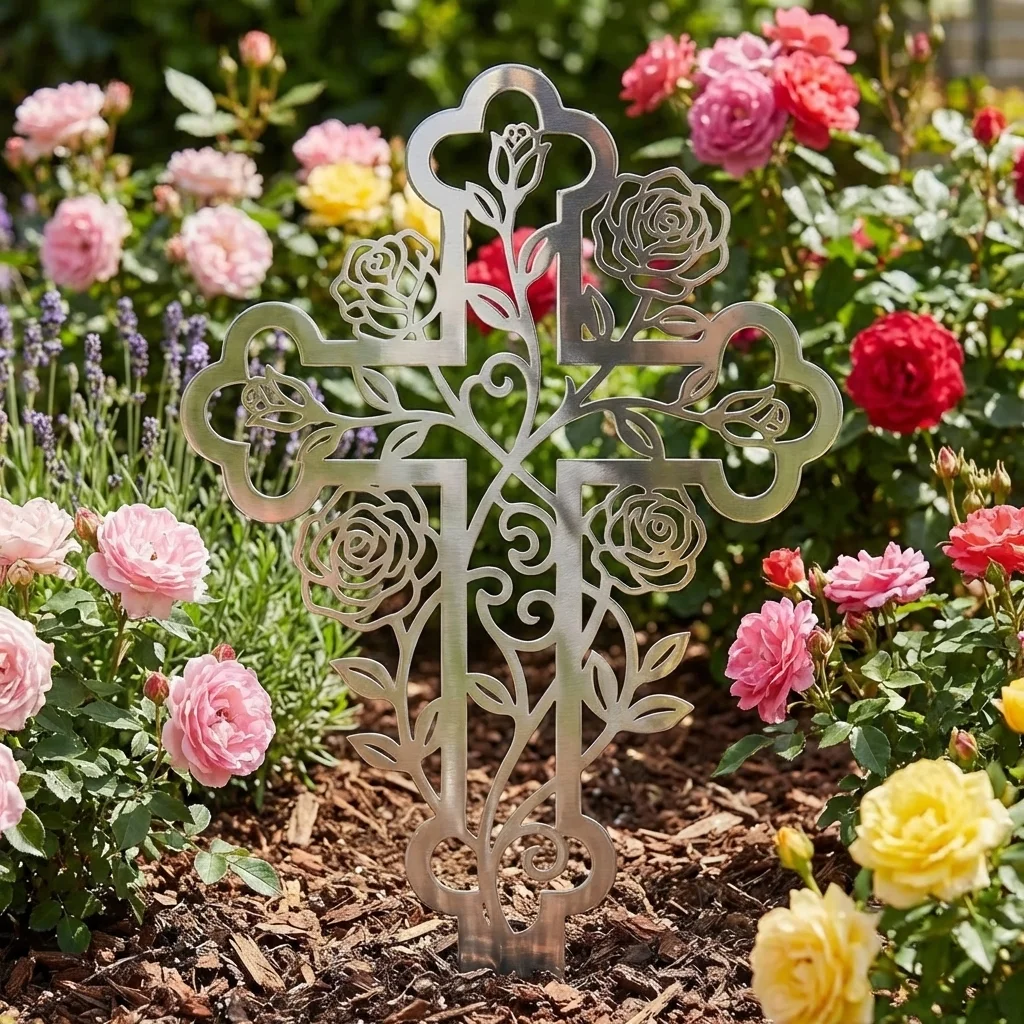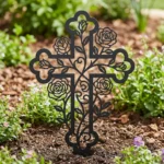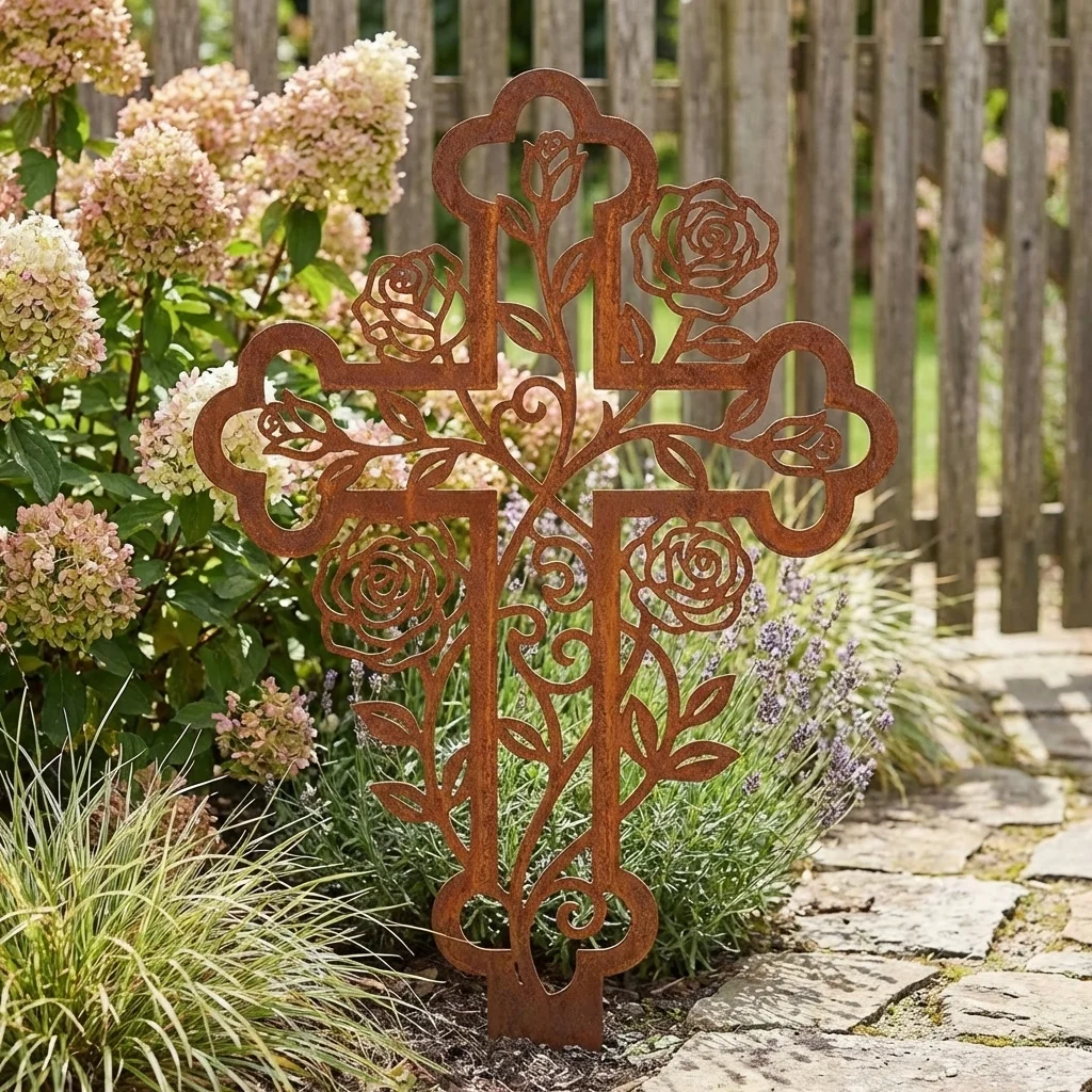 Krzyż Różanej Łaski – metalowa dekoracja do ogrodu