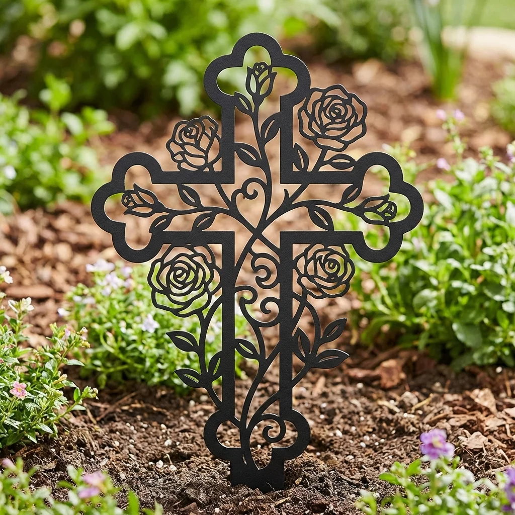 Krzyż Różanej Łaski łączy prosty, rozpoznawalny symbol z delikatnym motywem kwiatowym, który nadaje mu bardziej ozdobny i subtelny wygląd. To model, który dobrze odnajduje się zarówno w tradycyjnych ogrodach, jak i w bardziej romantycznych przestrzeniach, gdzie liczy się spokój, symbolika i dopracowany detal.