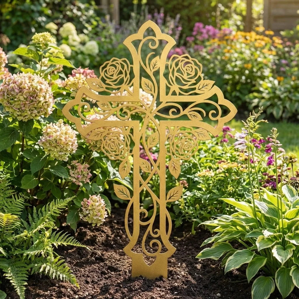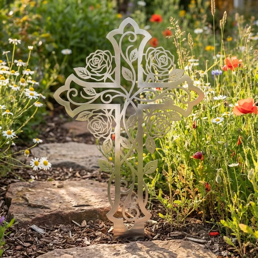 Krzyż Ogrodowy Różany – metalowa dekoracja do ogrodu