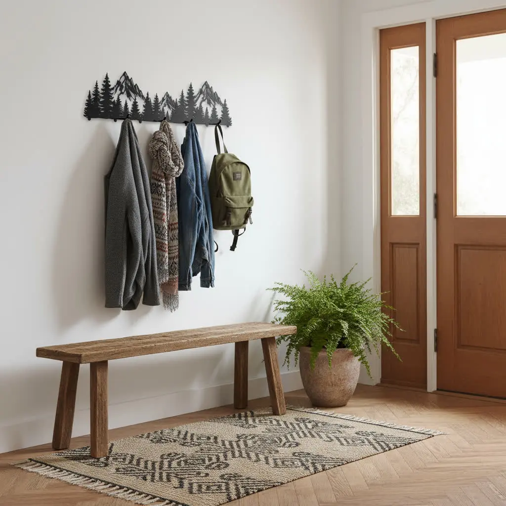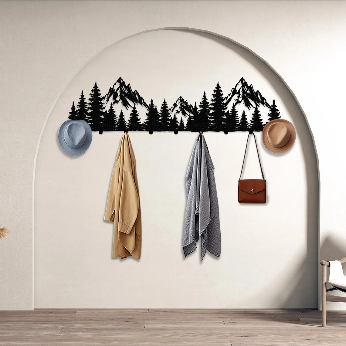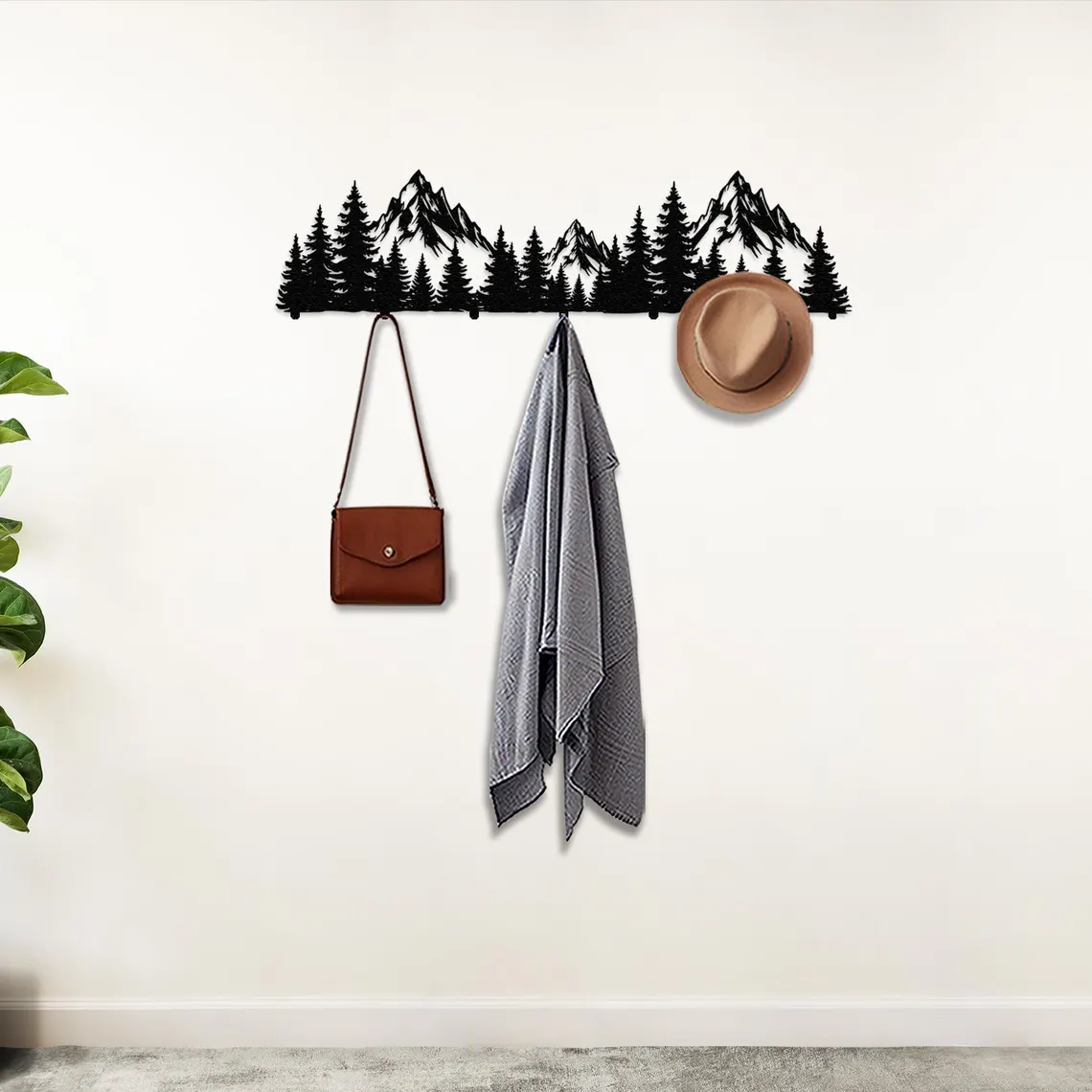 Metalowy wieszak ścienny Górski Las to połączenie funkcjonalności i unikalnego designu. Motyw gór i drzew nada wnętrzu niepowtarzalnego charakteru, a solidne haczyki zapewnią wygodne przechowywanie kurtek, kluczy i akcesoriów.