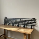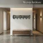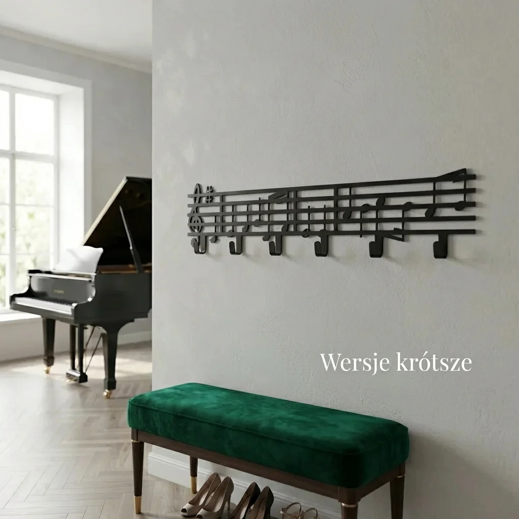 Metalowy wieszak ścienny „Nuty Muzyczne” z motywem pięciolinii i nut – praktyczna dekoracja do przedpokoju, salonu lub pokoju muzycznego. Szerokość do wyboru: 40/50/60/70/80/90 cm. Kolory/wykończenia: czarny, biały, złoty, srebrny, corten.