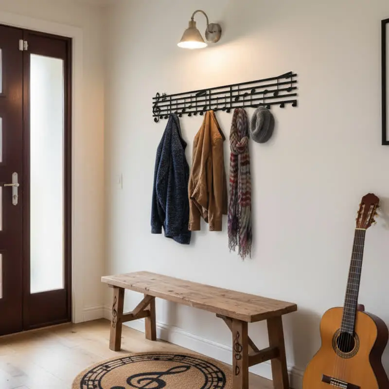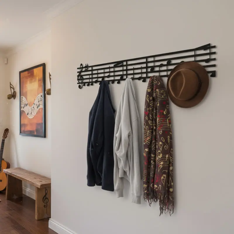 Metalowy Wieszak Ścienny Nuty Muzyczne to oryginalny i praktyczny dodatek do wnętrza. Motyw pięciolinii z nutami nadaje mu unikalnego charakteru i sprawia, że świetnie pasuje do domu melomana, muzyka czy fana sztuki.