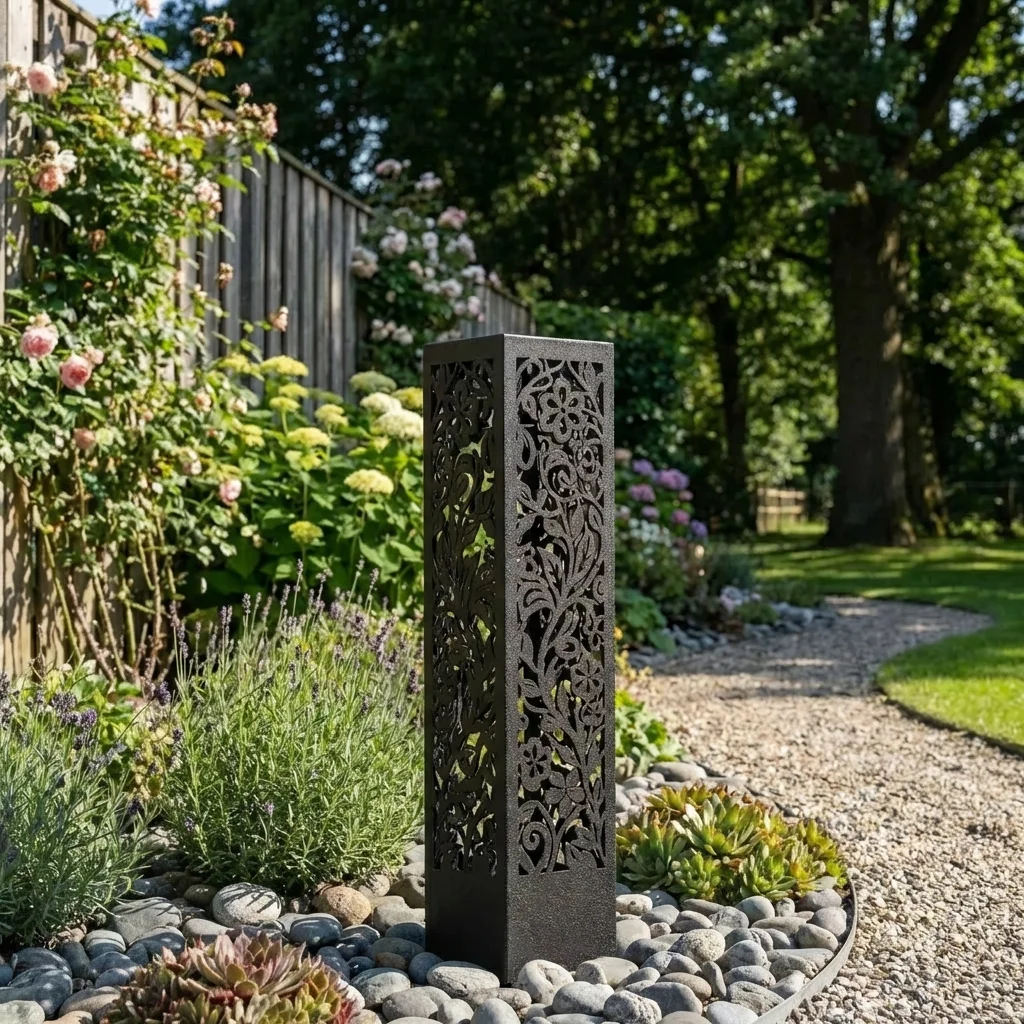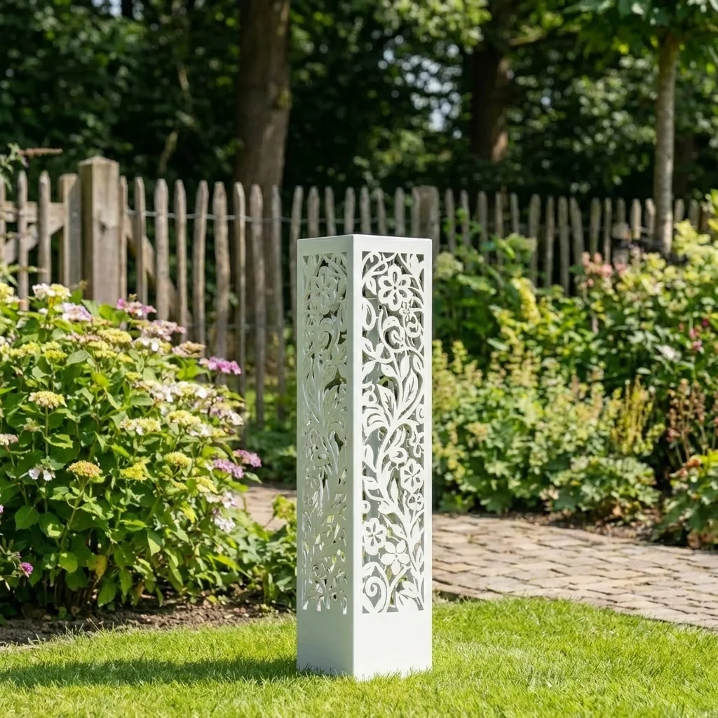 „Ogród Kwiatów” to elegancka, metalowa kolumna ogrodowa z dekoracyjnym, ażurowym wzorem inspirowanym motywami roślinnymi i klasycznym ogrodem kwiatowym. Zaprojektowana jako reprezentacyjny postument pod donicę lub samodzielna rzeźba ogrodowa, pięknie podkreśla kompozycje roślinne, ścieżki i strefy wejściowe.