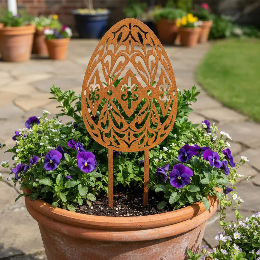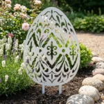 Ogrodowa dekoracja metalowa „Jajo Ogrodowe Nature Line” to ażurowa ozdoba do wbicia w ziemię, inspirowana wiosenną pisanką i motywami natury. Świetnie prezentuje się na rabacie, w skalniaku, przy wejściu do domu oraz w donicach i skrzyniach. Wycięcia w metalu tworzą delikatny efekt światło/cień, dzięki czemu dekoracja wygląda lekko i elegancko.