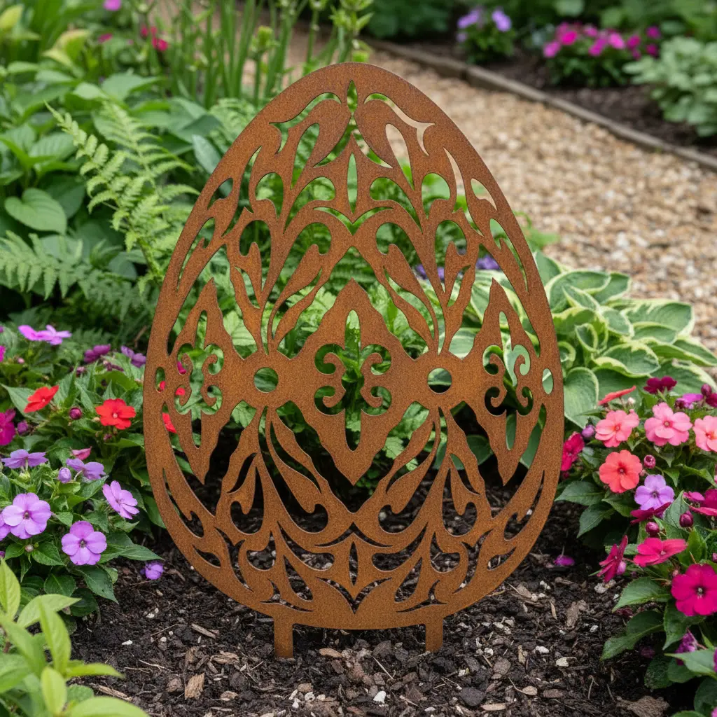 Ogrodowa dekoracja metalowa „Jajo Ogrodowe Nature Line” do wbicia w ziemię – ażurowa pisanka inspirowana naturą, idealna na rabaty, skalniaki i do wiosennych aranżacji. Rozmiary: 11×15 cm (szpilka 6), 15×20 cm (szpilka 8), 18×25 cm (szpilka 10). Wykończenia: Corten, stal malowana proszkowo (czarna/biała/złota) lub stal nierdzewna (polerowana/szczotkowana). Darmowa dostawa w Polsce.