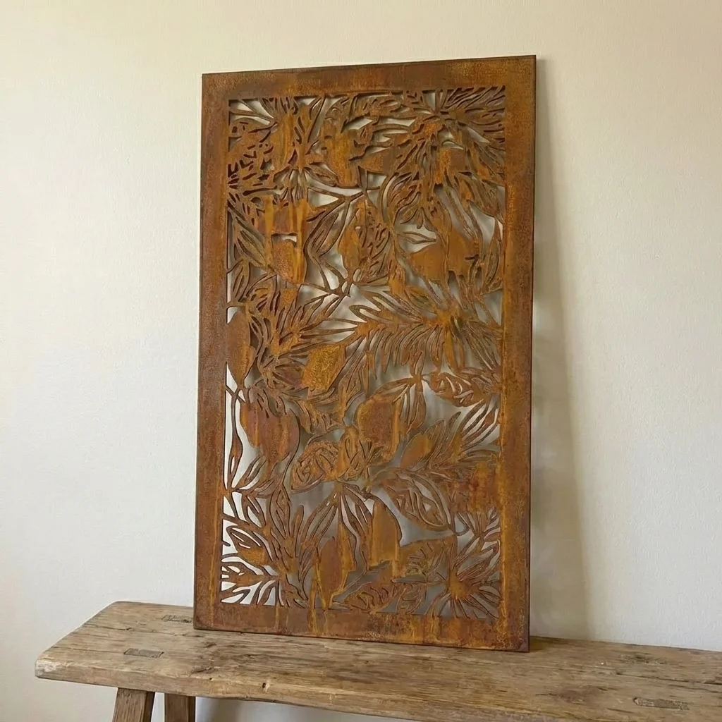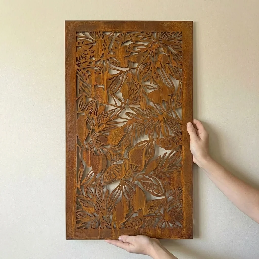 Panel Dekoracyjny Metalowy Amazonia to dekoracja inspirowana tropikalną dżunglą – ażurowy motyw bujnych liści wprowadza do przestrzeni egzotyczny, naturalny klimat. Panel świetnie wygląda we wnętrzach (salon, sypialnia, biuro), ale sprawdzi się też jako element tarasu czy ogrodu – szczególnie tam, gdzie liczy się efekt światła i cienia.